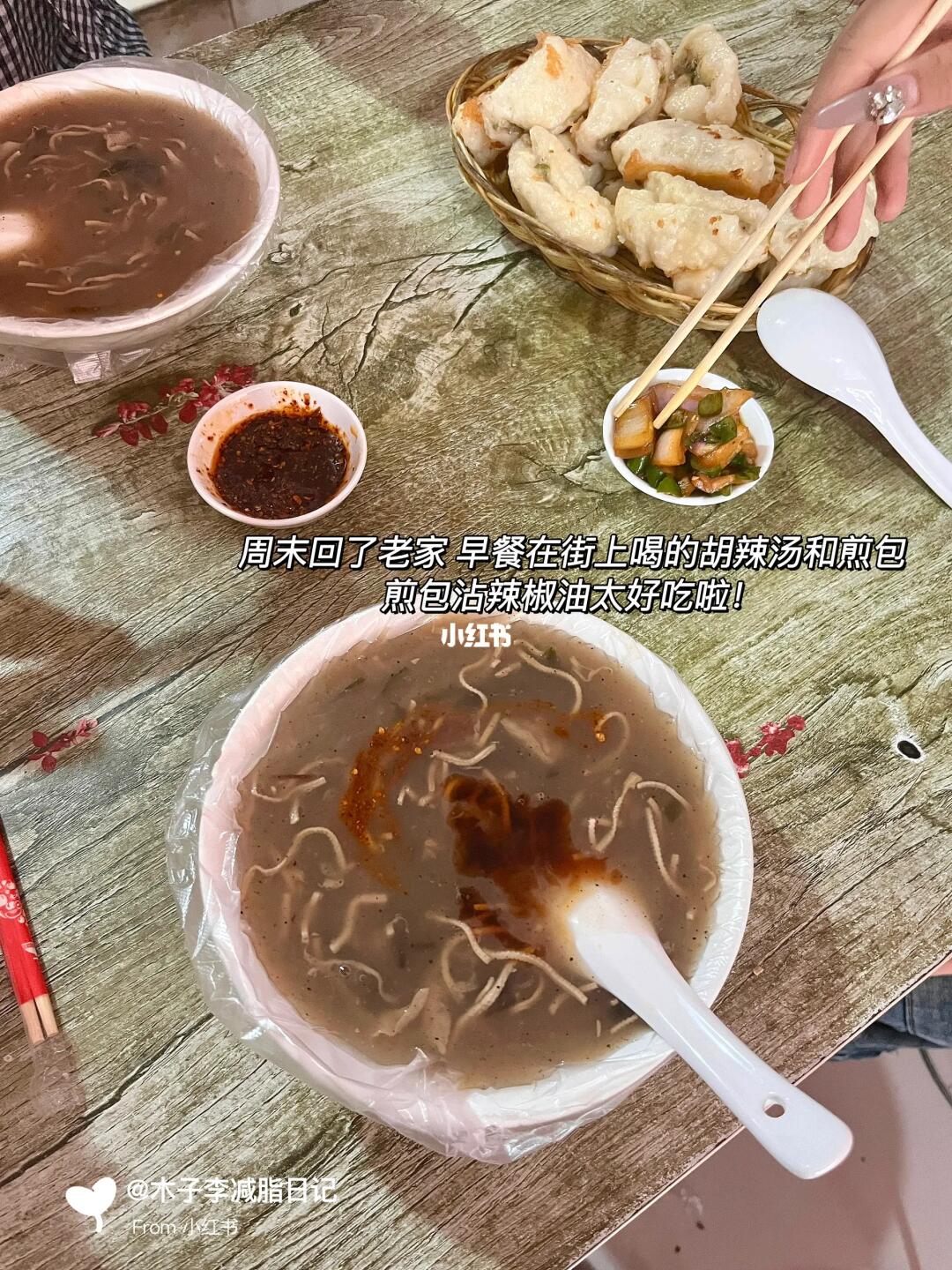 ●原体重:120斤 | 现重:89斤 | 已↓31斤 - 🥣早:胡辣汤 水煎包 🥣午:家常菜 一半蛋糕 🥣晚:家常菜 小米粥 🥣加:冰拿铁 、 💧喝水2000ml 🏋️运动:🈚 - 💭这周末回老家陪妈妈过了生日!去街道吃了最爱的胡辣汤➕煎包!每次回老家就是放纵的吃 开心的吃 !不会刻意控制 吃饱就好~ 好好吃饭 健康减脂!
