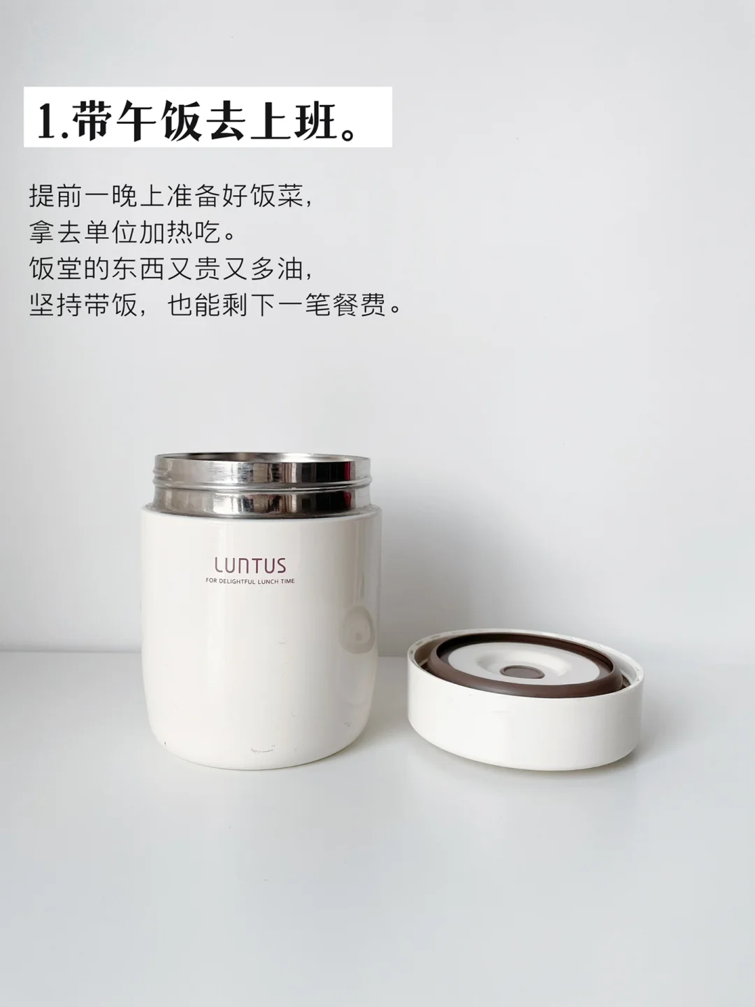 提前一晚上准备好饭菜,拿去单位加热吃。饭堂的东西又贵又多油,坚持带饭,也能剩下一笔餐费。