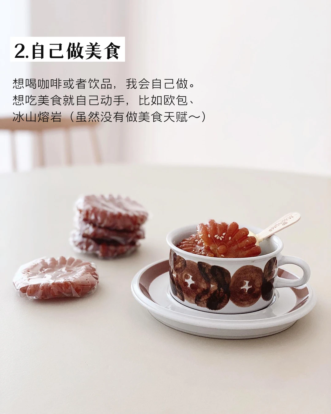 想喝咖啡或者饮品,我会自己做。想吃美食就自己动手,比如欧包、冰山熔岩(虽然没有做美食天赋~)