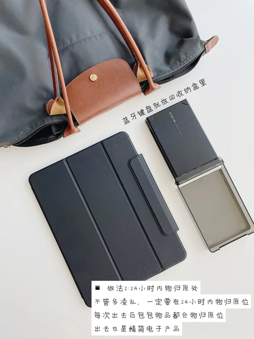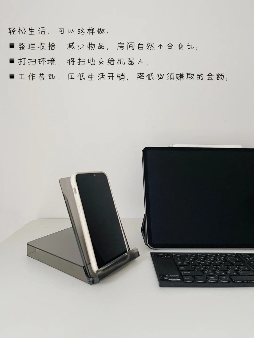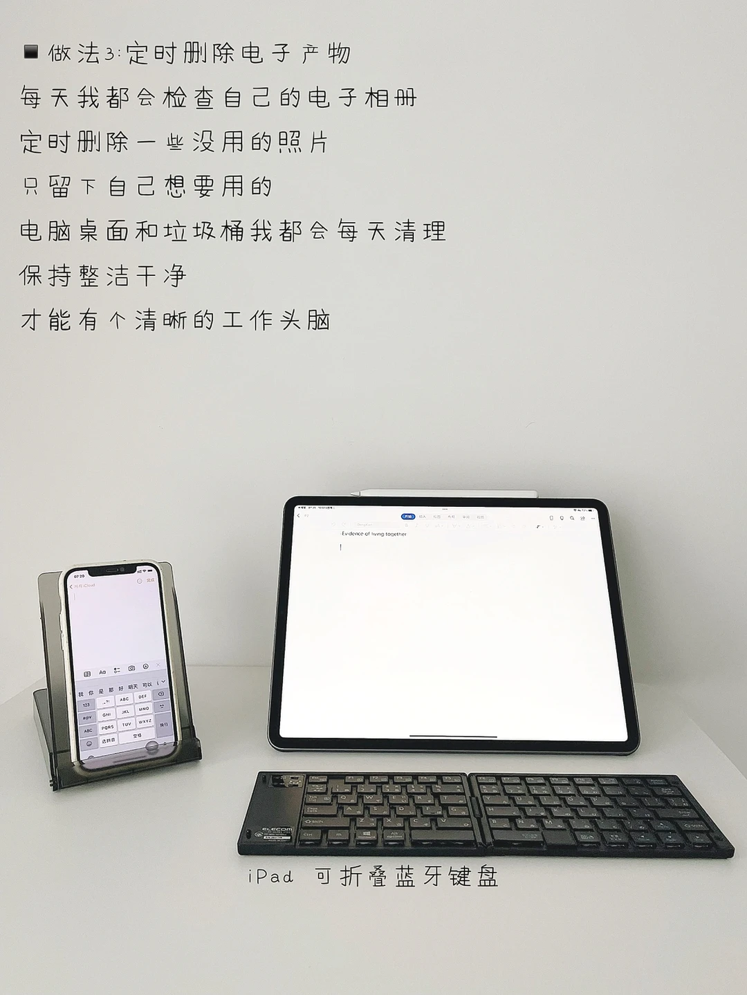 精简生活后,我出门都是带精简方便的电子产品:图所示的IPAD和ELECOM可折叠键盘,键盘的轻巧便携,帮助我外在办公,省去麻烦事,键盘收纳盒还可以当手机支架,一物多用,提高办公生产力。