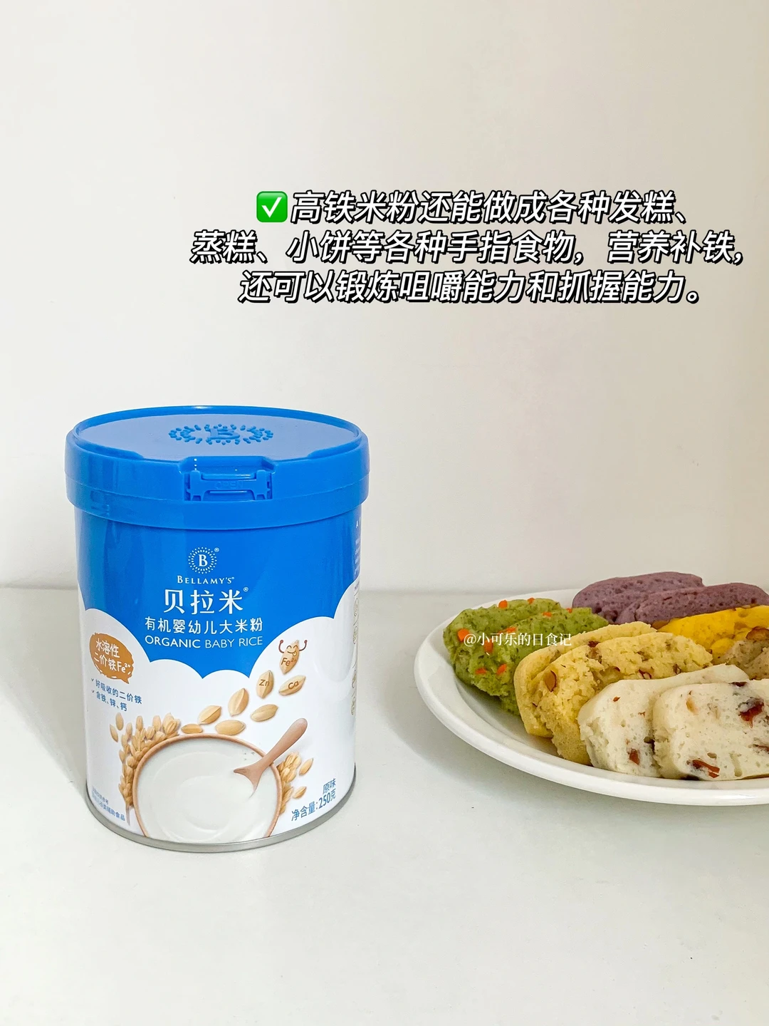 这次发糕里用的高铁米粉,是我家宝一直在吃的贝拉米有机高铁米粉。6个月后,宝宝进入生长高峰期,从母体中带来的铁就差不多消耗殆尽了,需要重视补充。根据2022居民膳食指南建议“6个月后宝宝每天要摄入10mg铁,其中97%的铁需要来自辅食”。高铁米粉就是不错的选择。