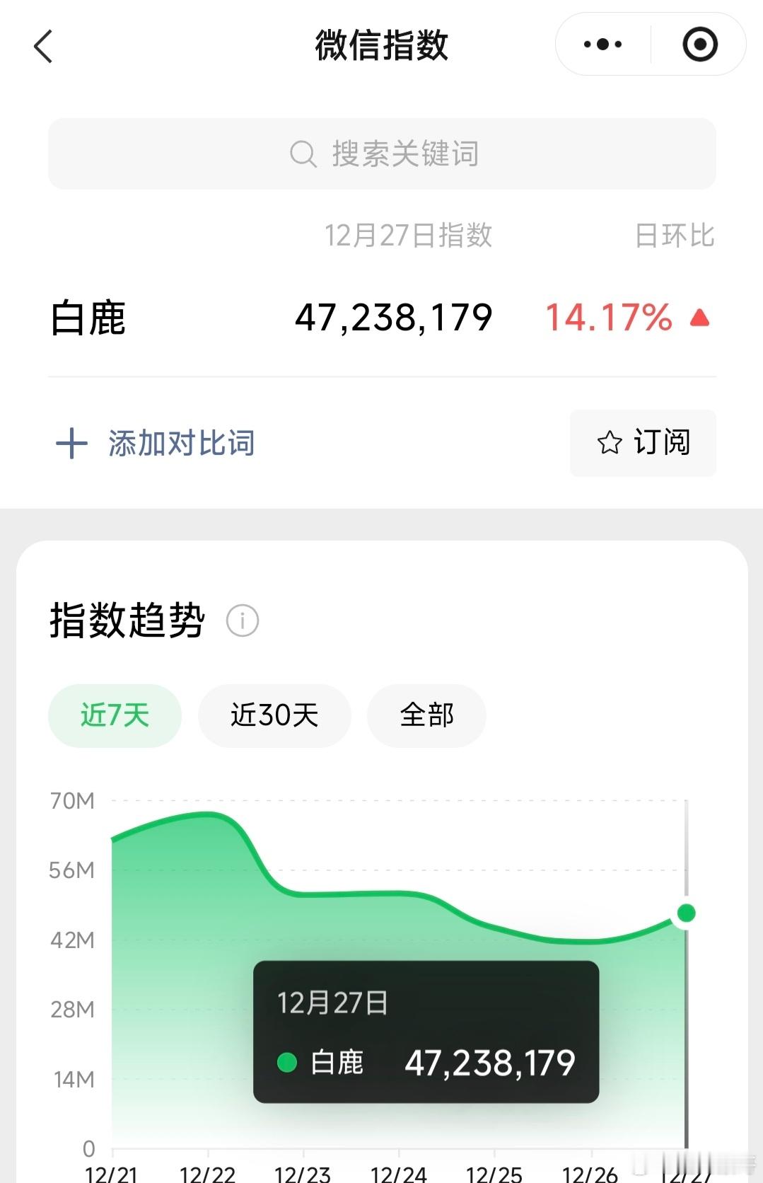 白鹿热度超牛,她已经半年多没播剧了,但近一个月的抖指每日平均高达208w,比很多在播剧的艺人还要高,而且昨日的微指又从4100w大涨到4700w,有点夸张