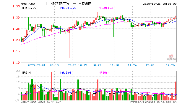 12月26日,上证50ETF广发(510950)涨0.54%,成交额1645.34万元。当日份额增加675.00万份,最新份额为7245.00万份,近20个交易日份额增加300.00万份。最新资产净值计算值为9425.02万元。