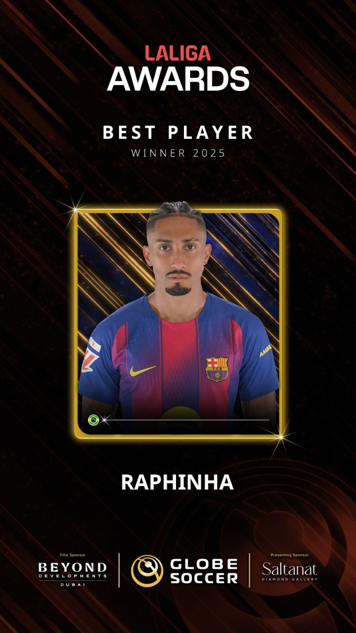 直播吧12月29日讯环足奖颁奖典礼已圆满落幕,巴萨成为最大赢家。亚马尔获得当选为2025环足奖最佳前锋奖,拉菲尼亚和弗里克则分别授予西甲最佳球员和最佳教练奖。拉菲尼亚未能亲临现场,他本人通过远程视频发表了获奖感言。
