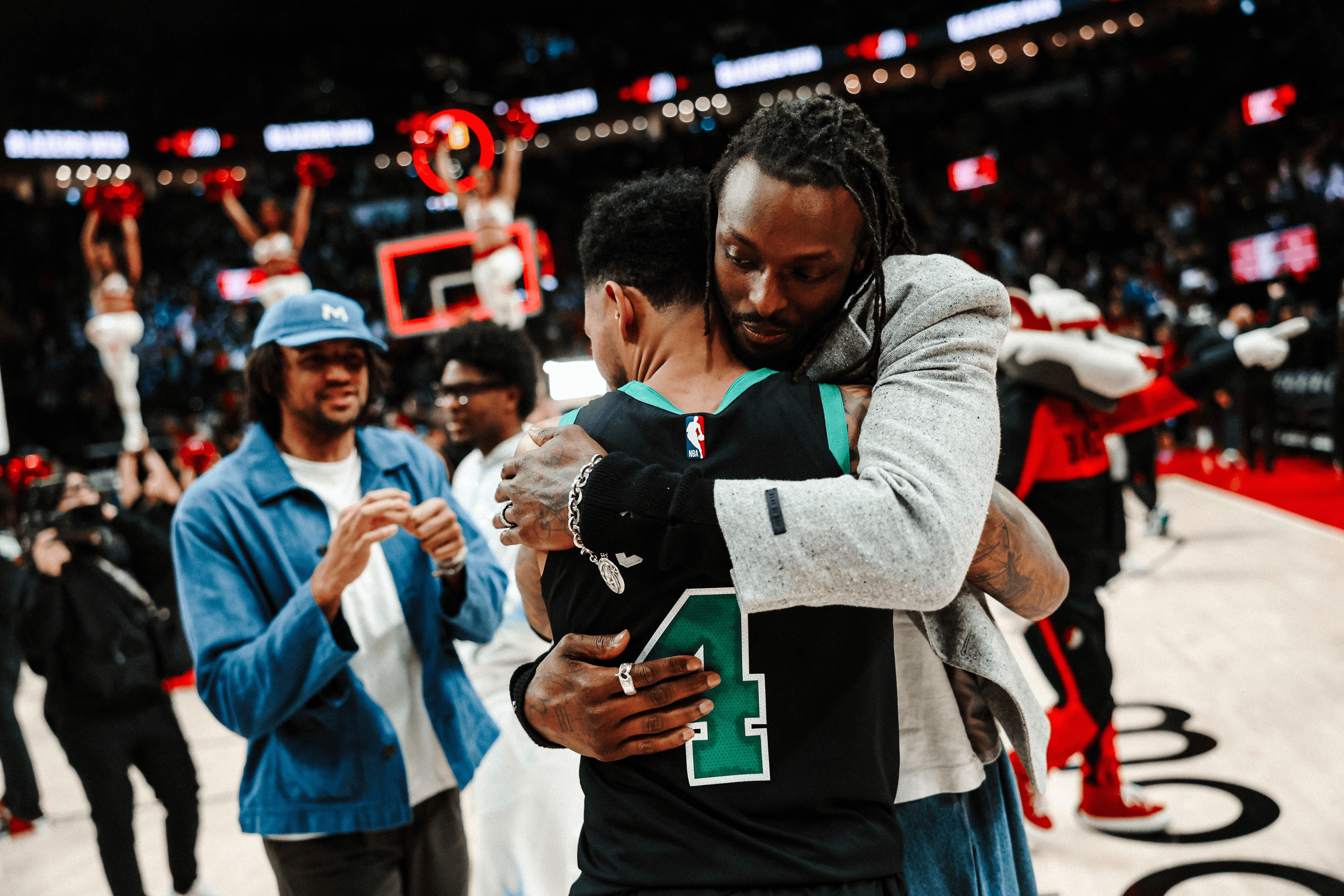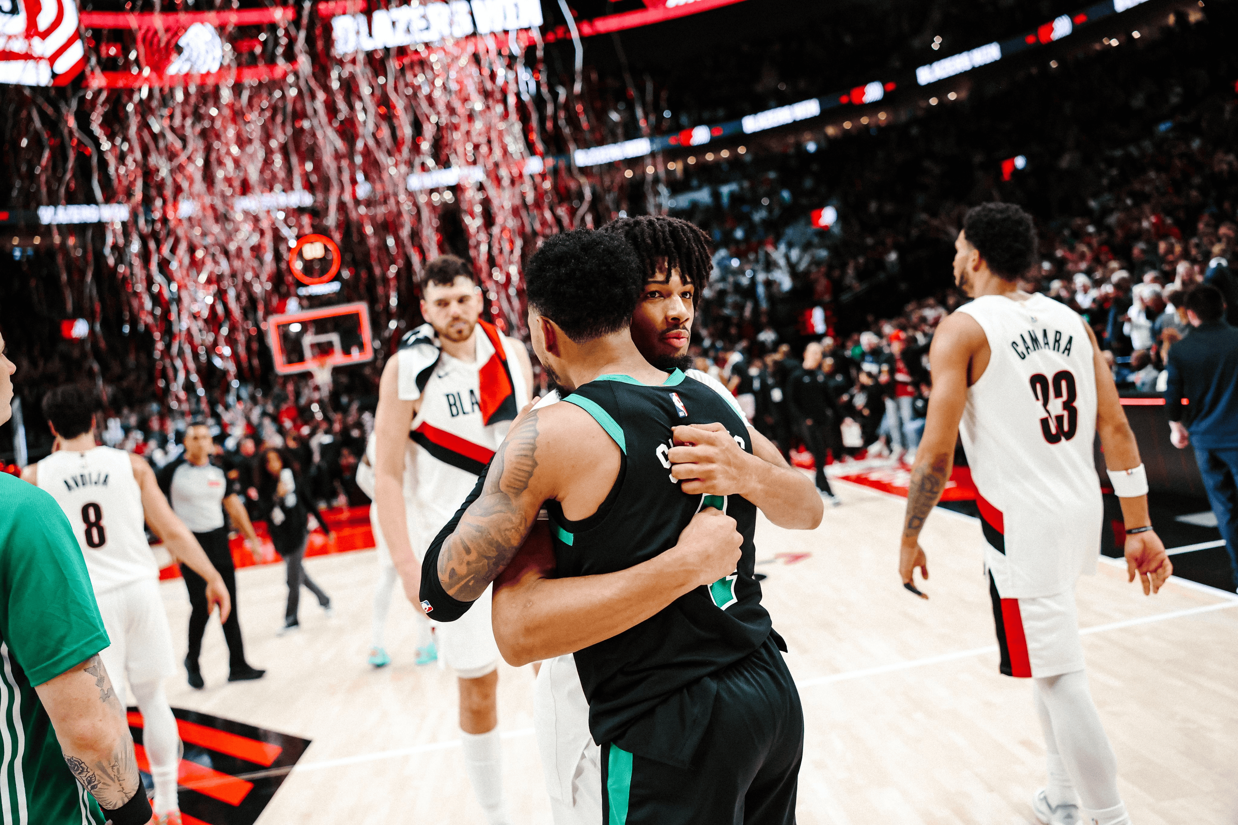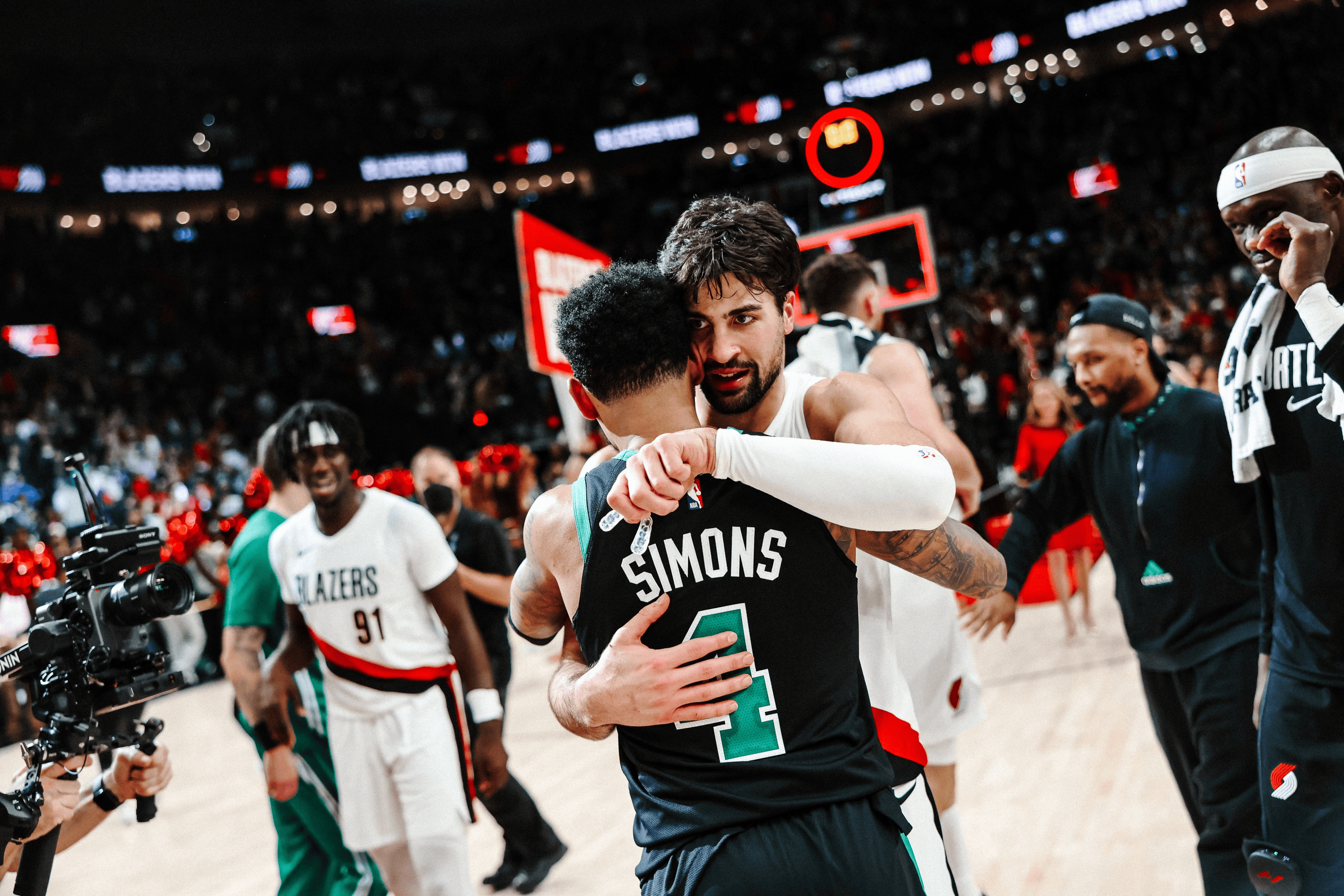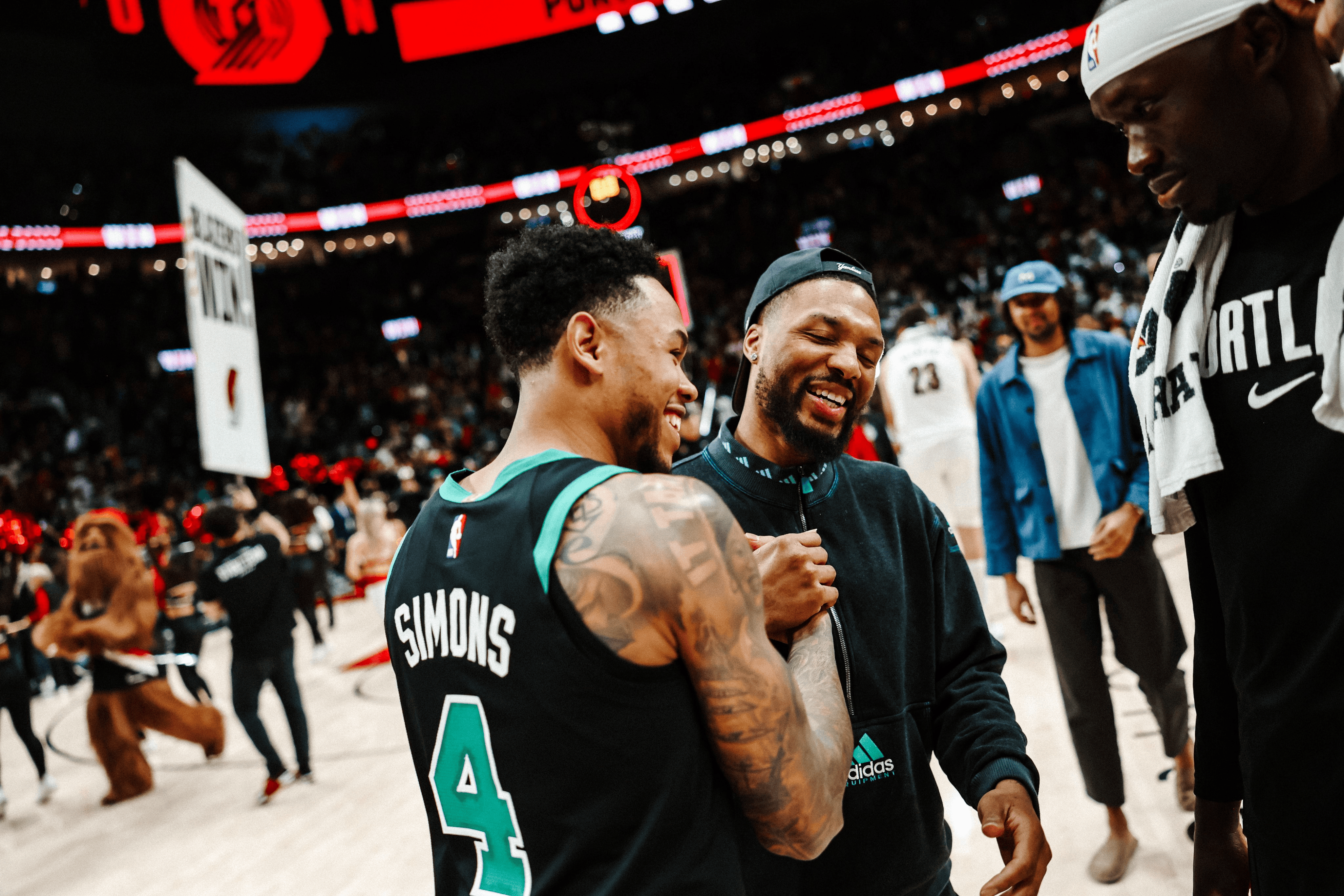 开拓者官方晒出全队赛后和安芬尼-西蒙斯拥抱照:精彩的比赛,很高兴见到你。