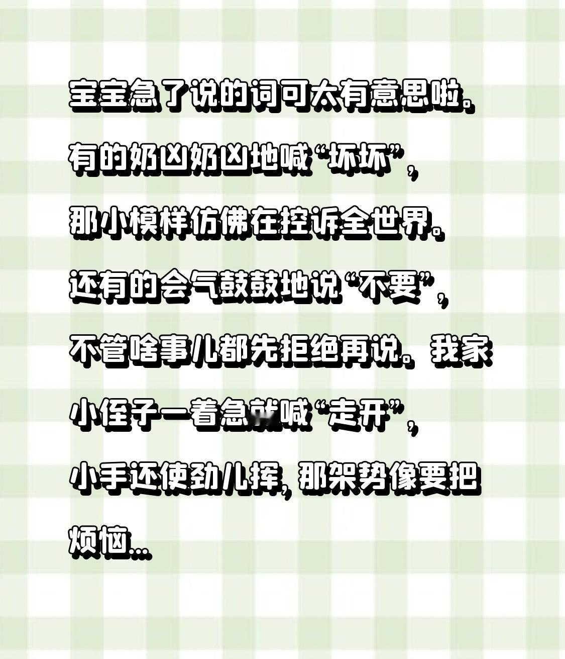 宝宝急了说的词可太有意思啦。有的奶凶奶凶地喊“坏坏”,那小模样仿佛在控诉全世界。还有的会气鼓鼓地说“不要”,不管啥事儿都先拒绝再说。我家小侄子一着急就喊“走开”,小手还使劲儿挥,那架势像要把烦恼都赶走。更可爱的是,有些宝宝会自创词汇,叽里咕噜说一堆谁也听不懂的话,可他们自己觉得表达得超清楚。这些词虽然简单,却满是宝宝的小脾气和小情绪,让人忍不住觉得可爱。