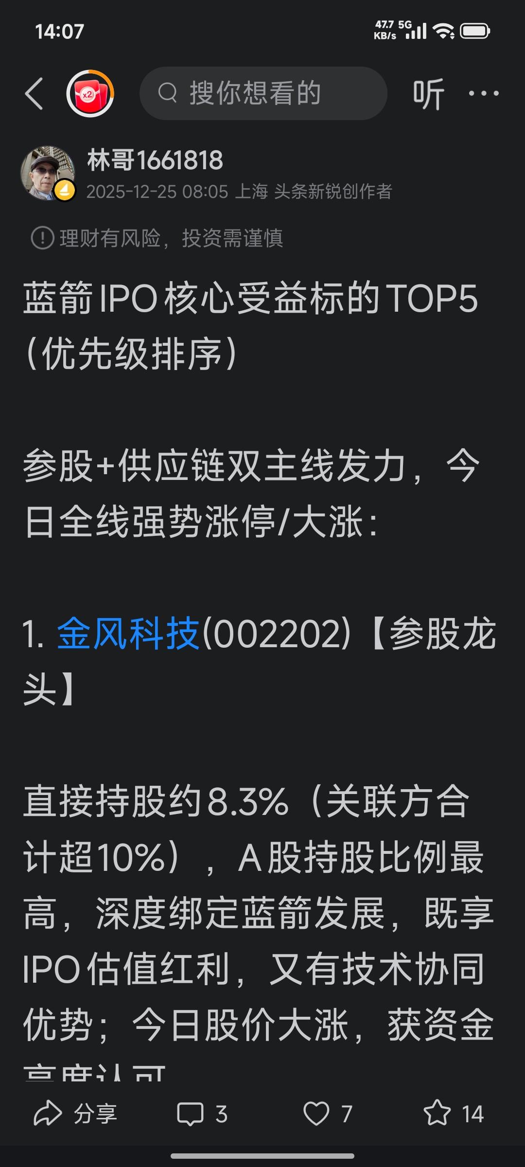 今天盘前发的微头条提及的蓝箭IPO关联股,金风科技,超捷股份上海沪工,派克新材都涨停了。有没有关注的人却没有上车的?