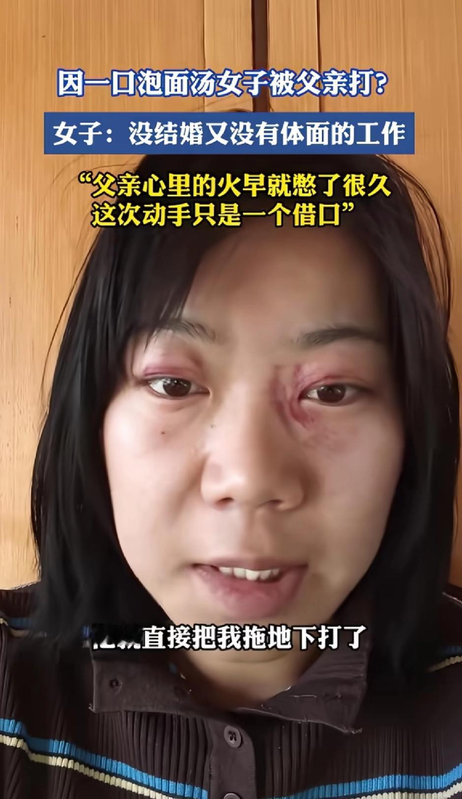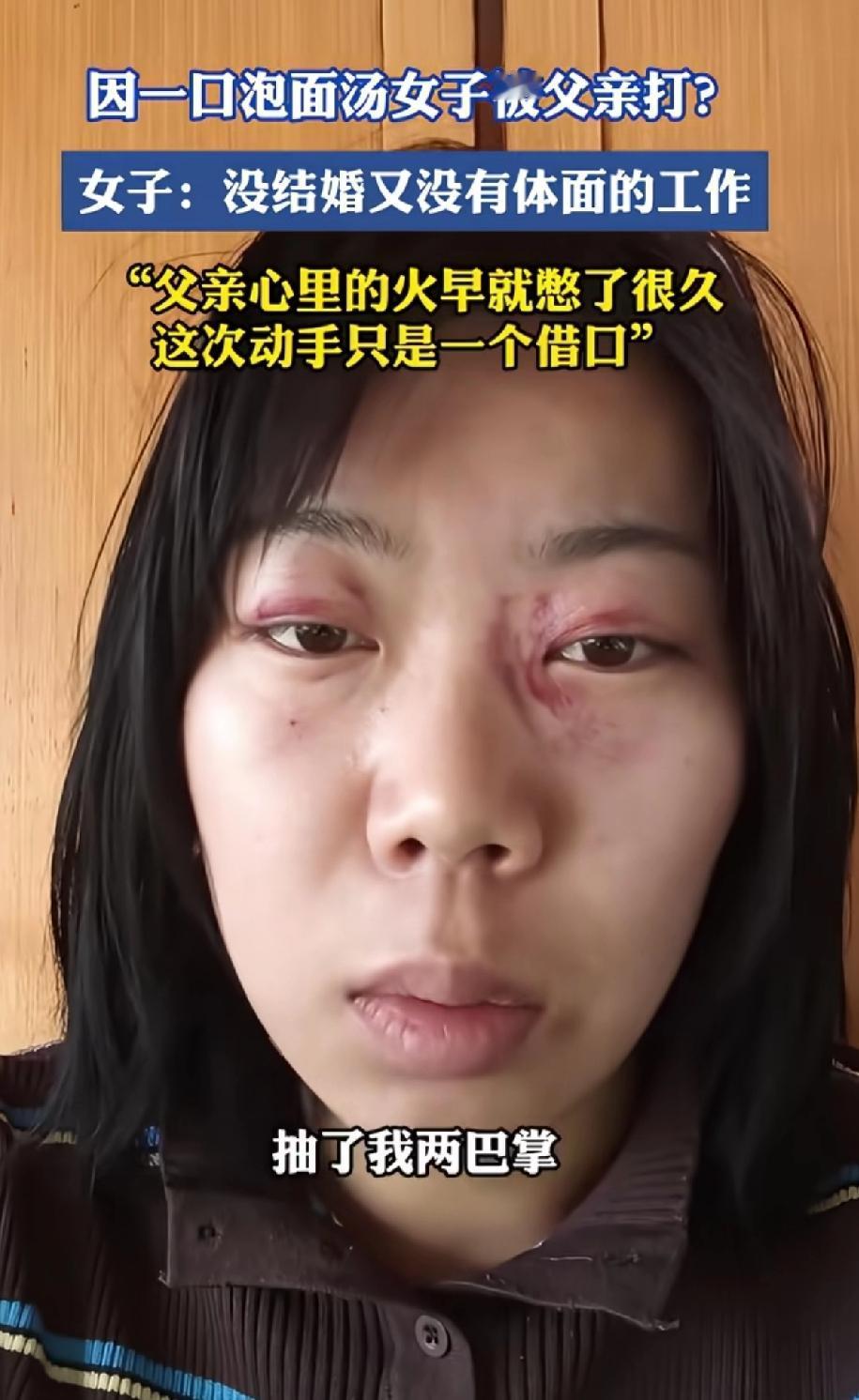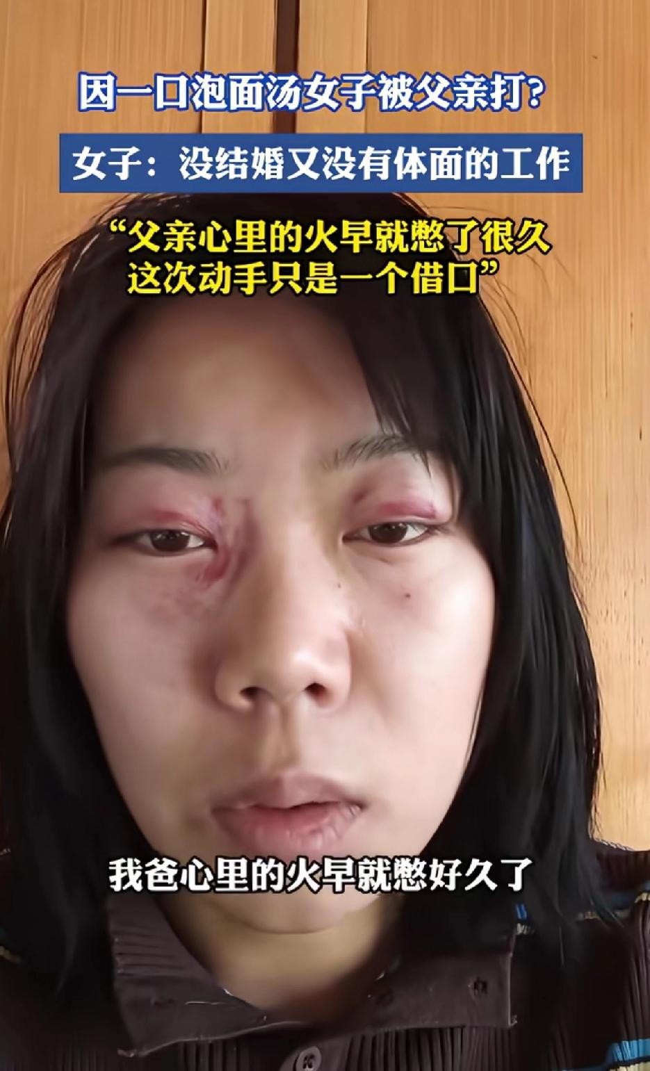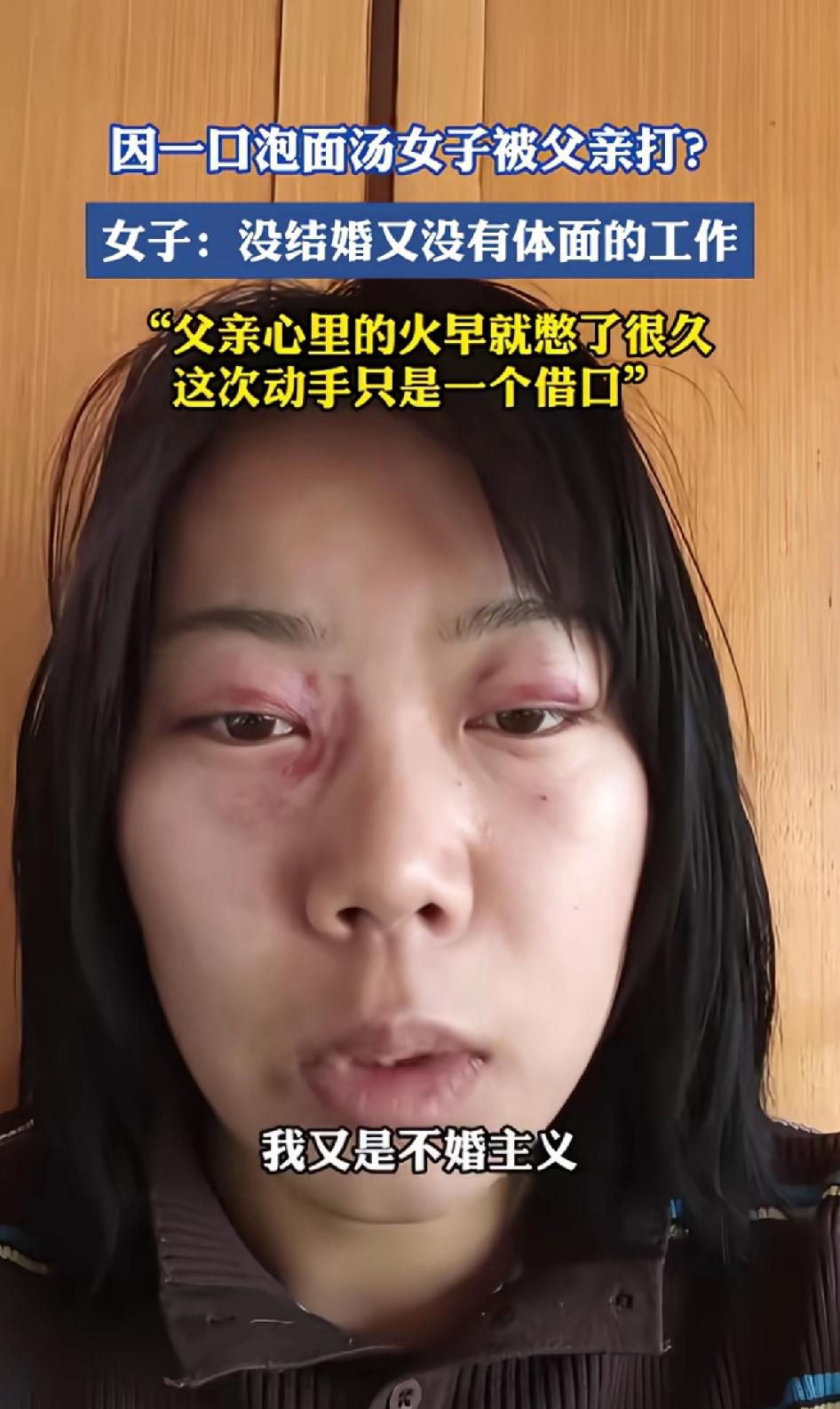 因为一口泡面汤女子被父亲打? 女子只是想喝一口弟弟的泡面汤,就被父亲抽了两巴掌?事后女子说出了事情的起因。 视频里的女子:双眼红肿带着明显被打的痕迹,讲述了父亲为什么打自己。 所谓的喝一口“泡面汤”只是这件事情的导火索! 女子称自己没有体面的工作,又是不婚主义,到了合适的年纪,既没谈对象,也没成家。 父亲看在眼里急在心里,久而久之心里憋了很久“火”寻着机会打了女儿一顿。喝泡面汤只是一个借口。 这个老父亲打女儿也是急眼了,普通父母就是希望儿女,上大学、工作稳定、结婚、生子。 孩子们完成这些,这样他们就放心了,觉得自己完成任务了。 视频里的女孩说自己是不婚主义,工作又一般,那父母肯定着急,在普通父母眼里这就是“老大难”,不过父亲这种做法太极端,孩子都这么大了,还动手,把孩子的脸打成那样子,让孩子怎么出去见人。 老思想也要适应新社会,不结婚就要被打,可即使你打了她,她就愿意结婚了?前几天那个跳楼的女教师,被父母逼得结婚当天从楼上一跃而下,这种悲剧的发生还不是因为父母逼迫。 她有工作养活自己,身心健康,不结婚又能怎么样,也没危害社会,为什么一定要逼着她结婚呀。 还用这种极端的方式催婚,不怕孩子更叛逆,父女之间矛盾加重,到时候后悔不及! 父母应该顺其自然,营造良好的家庭氛围,让孩子在家庭里感觉到幸福,她才愿意和别人组成一个家庭。而不是非打即骂,强势逼迫。