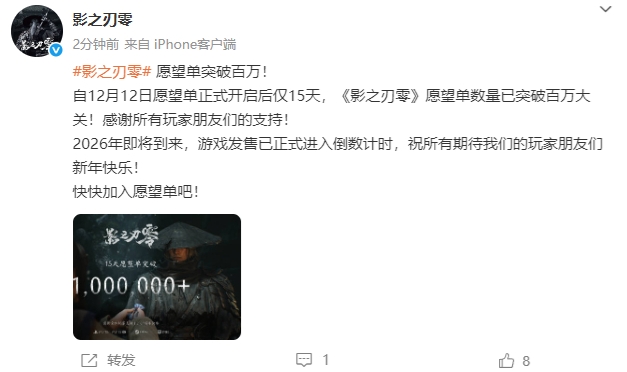 直播吧12月29日讯 国产3A武侠动作游戏《影之刃零》全平台愿望单数量在商店页上线15天内突破100万。游戏定于2026年9月9日全球同步发售,登陆PS5及PC平台,Steam商店页现已上线。