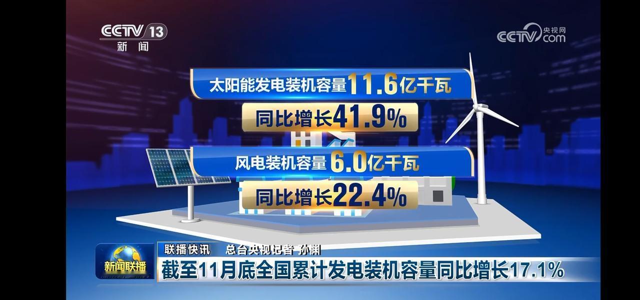 截止11月底,全国累计发电装机容量37.9亿千瓦,同比增长17.1%。 其中太阳能发电装容量11.6亿千瓦,同比增长41.9%;风电装机容量6.0亿千瓦,同比增长22.4%。占总装机容量近50%。