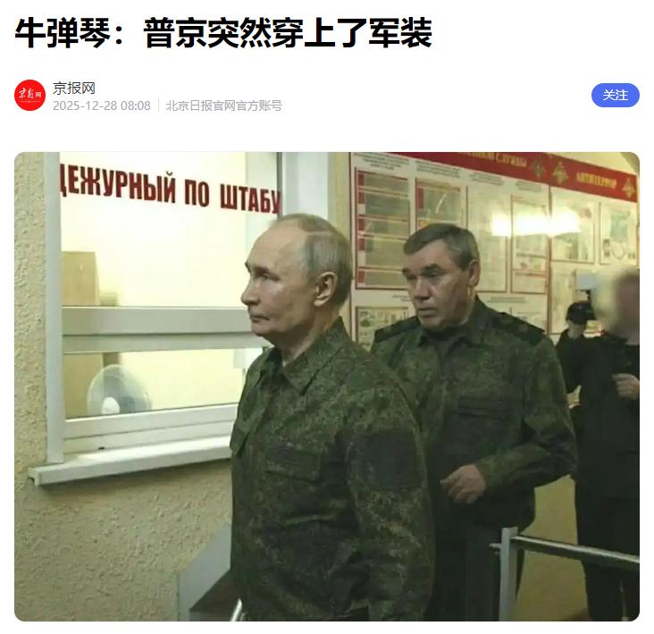 乌克兰要迎来麻烦了,因为普京突然穿上了军装。熟悉普京的人都知道,他一旦穿上军装,就意味着问题严重了。 12月27日,普京在视察俄军联合指挥部并召开军事会议时,一身的迷彩军装引起了全世界的关注。 普京曾经作为一名克格勃,行事风格向来沉稳果决,极少在公开场合以军装形象示人,但凡穿上军装,必然是国家面临重大安全挑战,或是需要展现强硬立场的关键节点。 远的不说,此前在应对地区安全危机时,普京仅有的几次军装亮相,都伴随着俄罗斯清晰且强硬的战略表态,后续也都采取了雷霆万钧的行动。 而在如今俄乌冲突持续胶着的背景下,他再度身着军装公开亮相,其释放的信号再明确不过:俄罗斯在对乌问题上,已经没有了太多妥协的余地。 这一信号,显然是针对泽连斯基政府此前抛出的所谓“和平计划”。 泽连斯基政府此前多次向国际社会兜售其“和平方案”,但这份方案从一开始就带有明显的片面性,忽视俄罗斯的核心安全关切,本质上是想让俄罗斯接受战败国的条件,这样的方案自然不可能被俄罗斯接受。 此前俄罗斯方面已经通过多种渠道明确表态,对这份不切实际的“和平计划”不予认可,但泽连斯基政府依旧不依不饶,还在不断向西方索要更多武器装备,试图通过军事手段扭转战局。 此次普京以军装形象亮相,更是用最直接的方式表明了俄罗斯的态度:对泽连斯基的“和平计划”不屑一顾。在俄罗斯看来,真正的和平必须建立在尊重双方核心利益的基础上,而不是一方对另一方的胁迫。 泽连斯基政府寄希望于西方的军事援助来压垮俄罗斯,显然是打错了算盘。俄罗斯作为军事强国,有着充足的战略储备和坚定的决心,不会任由外部势力和乌克兰当局损害自身的安全利益。 对于乌克兰来说,普京的这一举动无疑是一个危险的信号,意味着乌克兰接下来可能要面临俄罗斯更加强硬的军事打击和战略施压。 此前,俄乌冲突已经让乌克兰的经济民生遭受重创,基础设施损毁严重,大量民众流离失所。如果俄罗斯加大军事投入,乌克兰的处境将会更加艰难。 更关键的是,西方各国对乌克兰的援助已经出现了疲态,不少国家因为自身经济压力和国内舆论,已经开始缩减对乌援助规模,在这种情况下,乌克兰想要对抗俄罗斯,无疑是难上加难。 俄乌冲突的根源在于北约持续东扩带来的安全困境,俄罗斯的核心诉求始终是保障自身的战略安全空间,这一点理应得到国际社会的理解和尊重。 而泽连斯基政府如果真的为乌克兰民众着想,就应该放弃不切实际的幻想,正视俄罗斯的合理关切,主动寻求务实的谈判方案,而不是一味地向西方靠拢,将乌克兰推向更深的战争泥潭。