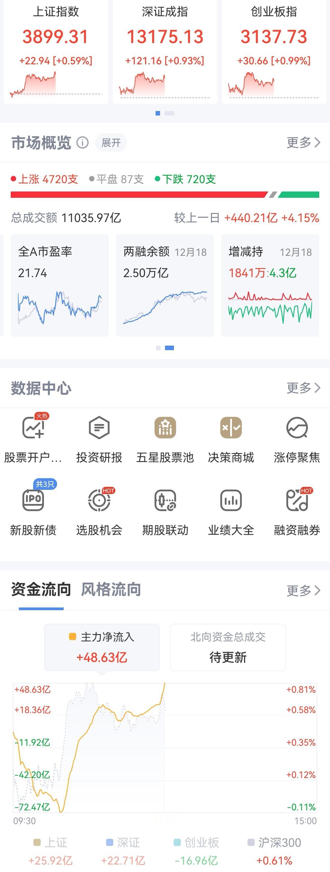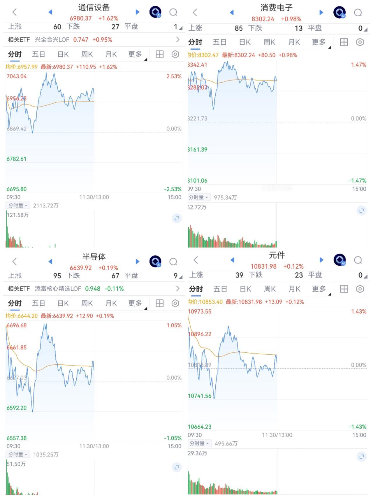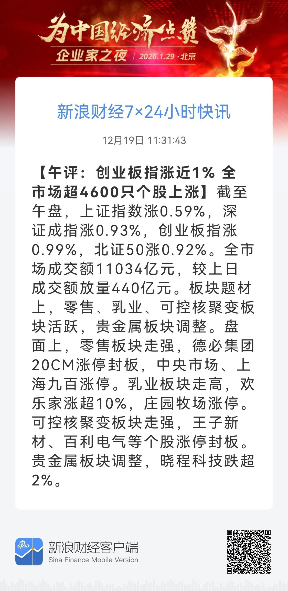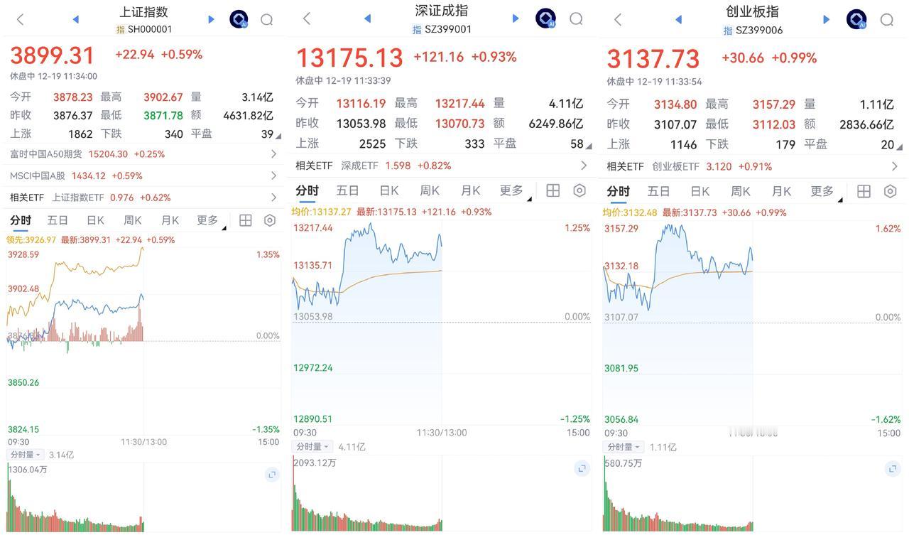 午盘印象(12月19日) 外盘利多 内盘稳定 AI争端暂缓 美科技反弹 科技板块跟随,CPO稍领涨 不见暴走,情绪升温 一、三大股指开涨明显: 个股开盘涨平跌比率54%:17%:29%。 个股稍强势,远胜上一交易日开盘。 二、指数震荡上涨: 三大指数节奏统一,震荡反弹修复 三、涨跌幅榜: 科技一般,红利平平 控制盘面 跌幅前列:化石能源、贵金属、大行保险 涨幅前列:自贸、地产产业链、消费 四、开盘和午盘: 开盘:沪+0.05%、深+0.48%、创+0.89%。 午盘:沪+0.59%、深+0.93%、创+0.99%。 指数拉升又震荡,个股普涨反弹。 五、午盘个股上涨85%,远超八成;与开盘相比 上涨个股大幅扩张。 资金净流入+49亿,资金流改善,早盘净流入,年底效应退散。 六、沪深两市成交量午盘10,882亿,上个交易日10,461亿,同比量能放大超400亿,小幅放量上涨。 七、上证遇支撑位连续反弹;深小创反弹,力度温和指数稳定。 新领军仍难寻,科技权重丢掉疯狂,个股稳住情绪反弹。 要不轮动,利于长久。 要不平淡,利于整固。 午后两种情形: 1、震荡温和上行:继续拉锯整理,时间换空间,再冲3910。 2、震荡平行修复:目标仍回踩,时间和空间加速统一。 (图片源自网络侵权告知删除)
