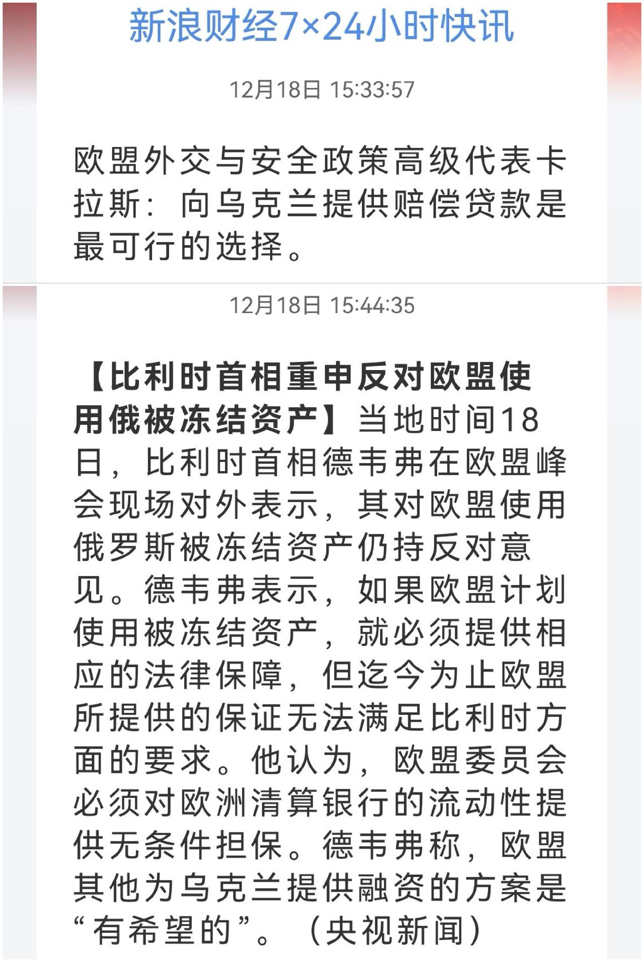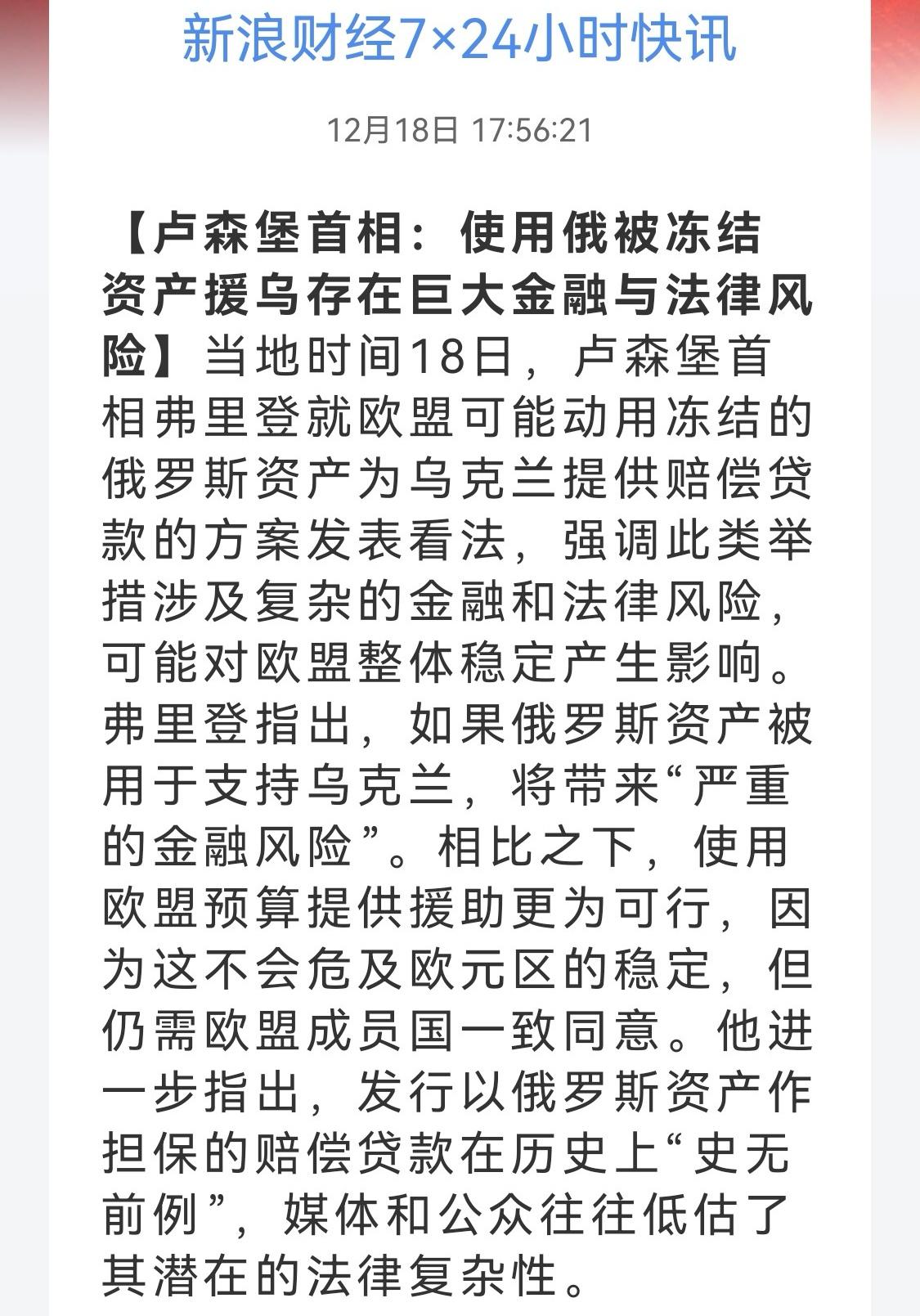 俄乌和谈进展~欧洲在玩火 美国已反对 欧盟不顾其它方反对,坚持推出“赔偿贷款” 欧盟峰会结论草案: 希望自2026年第二季度起为乌克兰提供财政支持,包括满足其军事需求。 方式方法~动用各种工具,基于现金余额,设立赔偿贷款。 一、支持方 1、欧盟委员会 确保乌方获得资金,解决比利时的担忧。 2、乌克兰 继续撺掇使用大鹅被冻结资金。仍在忽悠制裁和施压力度。 3、德国、瑞典、芬兰 这些都是被大鹅动过手的,不管是正义还是非正义。比如德国~~ 二、反对方 1、匈牙利(传统反派) 使用便宜的鹅油鹅气;认为乌方是累赘,不仅仅是经济,而且他还在和别人打架 2、卢森堡(理性完美的法律工作者) 历史无先例,法律在哪里;金融风险太大,谁敢再加大储备欧元,单方面动用就是抢夺;影响流动性,万一挤兑~~ 3、比利时(清算银行所在地) 动用可能会削弱欧元的市场地位;法律上并非万无一失;要求整个欧盟承担流动性风险,提供无条件担保;大鹅可能报复没收损害者的资产;如果条件不能得到满足,别想 三、美方态度:否认向欧盟施压以使其放弃使用大鹅资产向乌方提供援助。 多嘴: 方式上—— 就是向乌克兰提供贷款,以大鹅现金余额做抵押。就像房地产抵押贷款,只不过房产换成现金 贷款,就需要还款方案,谁来还?谁借谁换,但你一上来就做成“赔偿”,从目的上来讲就没准备让他还~~。上来就准备做成“坏账”的准备。 提前“定罪”,不管谁胜谁负,谁有理谁没理,你已经判定“大鹅有罪”。 再从法律上来讲,至少有一个“审判过程”,过过堂啊,这不是你们经常鼓吹的吗?即使是“十恶不赦的罪犯也有辩护的权利”,又变了? 现实情况—— 美国先抽身,这是你欧洲的战争,大鹅离我远着呢。欧盟出钱买美国武器,我还要赚钱,欧盟你拿着武器再捐助给乌方。 欧盟也开始耍赖,虽然乌方是在替你欧洲作战。但也不想出钱了,你乌方贷款买武器吧,欧盟做个二道贩子。 冻结资产不能直接给你,但用它做担保可以,至于谁还钱,可以永久冻结着,打完仗就知道了。不是他就是你~~咱仨你看谁更赖皮。 最后的焦点还是乌方,你看看泽连斯基所说“当前核心问题并非俄方是否有意结束冲突,而是其能否持续维系战事规模”。还是在想着“削弱大鹅”,已经给你3500亿,你丢了25%的领土。 一是,关键方,美国不愿意继续下去,害怕继续下去局势失控,影响到自己,万一出发北约第五条款咋办? 二是,你的骗术太差劲了,都想赶紧换了你,还在那想着继续弄钱呢。 洗洗睡吧,下一步就是清算你,不想结束,可能还是害怕冲突结束之后的“对账”吧~~ 从他的角度出发,这场冲突没有尽头~ (图片来源网络侵权告知删除)