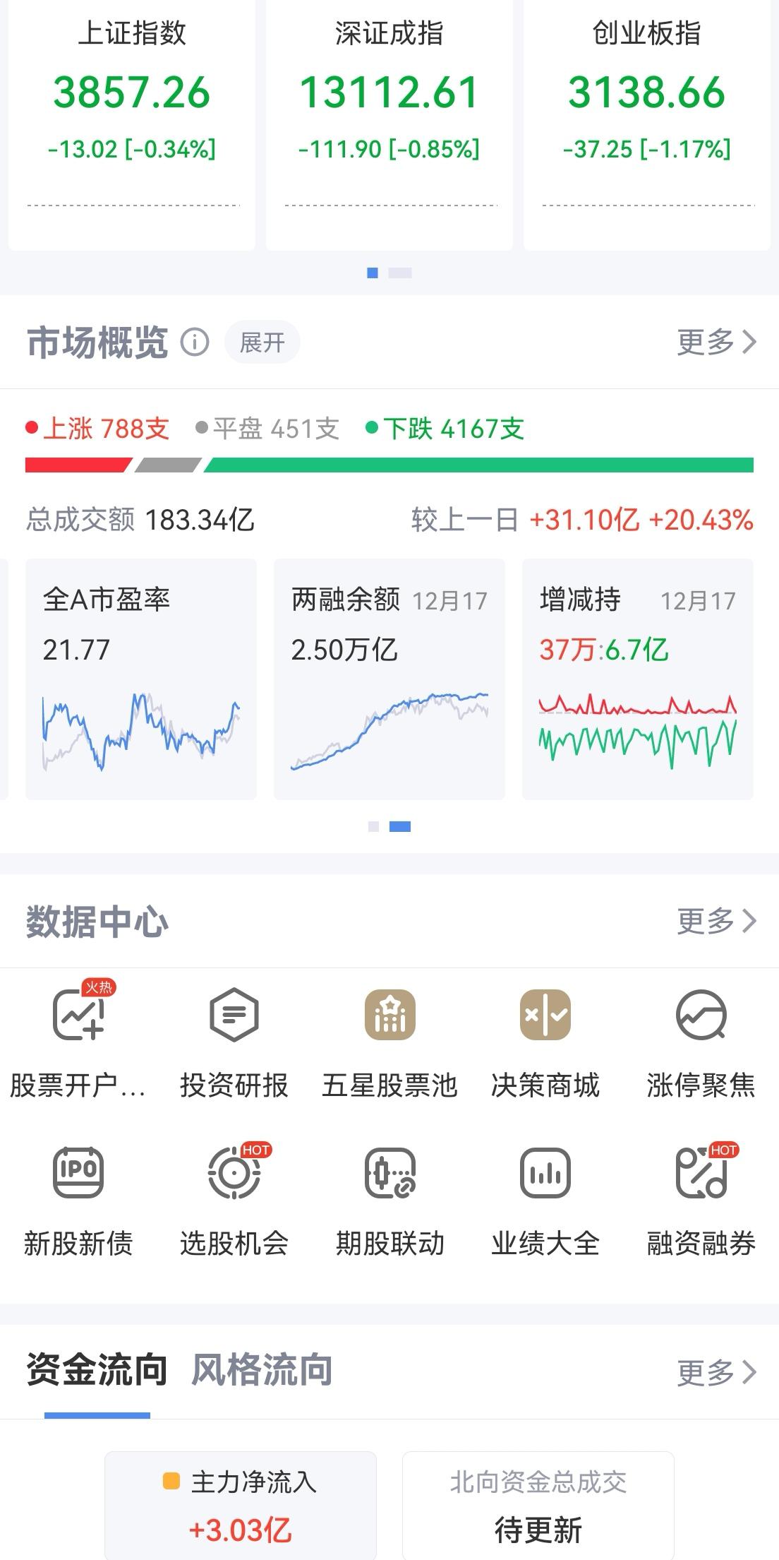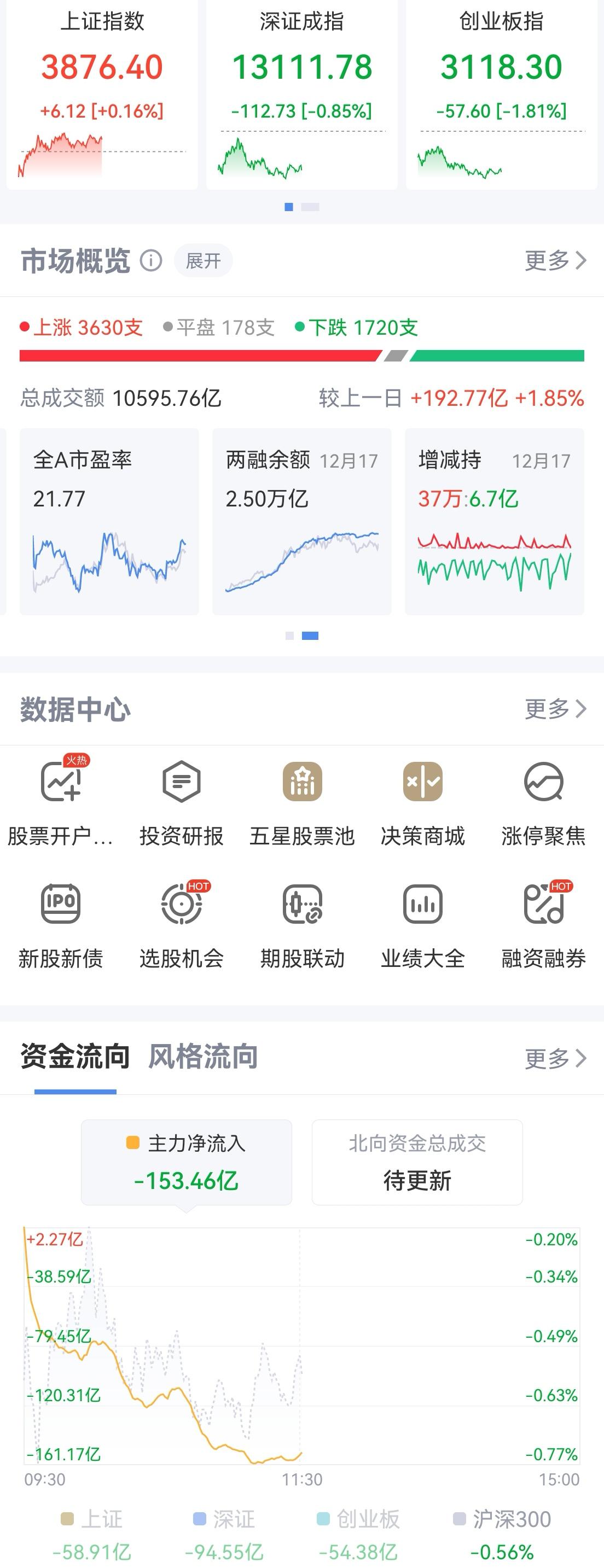 午盘印象(12月18日) 沪强深弱 低走震荡 美AI争端继续 达链跌势明显 科技股分化,AI硬件大跌 银行回暖护盘,个股转强和CPO跷跷板 一、三大股指开跌明显: 个股开盘涨平跌比率15%:8%:77%。 个股弱势,大弱于上一交易日开盘。 二、指数分化震荡: 上证回升红盘震荡,深小创低走震荡 三、涨跌幅榜: 科技分化,银行回暖 跌幅前列:AI硬件、电池、旗手 涨幅前列:航天军工、AI应用、银行 四、开盘和午盘: 开盘:沪-0.34%、深-0.85%、创-1.17%。 午盘:沪+0.16%、深-0.85%、创-1.81%。 指数平行震荡,个股反而回暖。 五、午盘个股上涨66%,接近三分之二;与开盘相比 上涨个股大幅扩张。 资金净流入-153亿,同期相比,细微萎缩,净流出仍低位,护盘有功。 六、沪深两市成交量午盘10,461亿,上个交易日10,249亿,同比量能放大约200亿,小放量涨跌不一,放量主要在上证,红盘。 七、上证支撑位反弹后震荡;深小创大幅回调,昨日“调整不充分”预警成真。 新领军不见,轮动难寻。CPO走低,个股反而回暖。 反常的CPO,不管英伟达走势。事出异常有问题,继续看下探支撑,创业板支撑2900。 午后两种情形: 1、震荡平行整理:拉锯又整理,时间换空间,再冲3910。 2、震荡跌幅扩张:目标仍回踩,时间和空间加速统一。 (图片源自网络侵权告知删除)