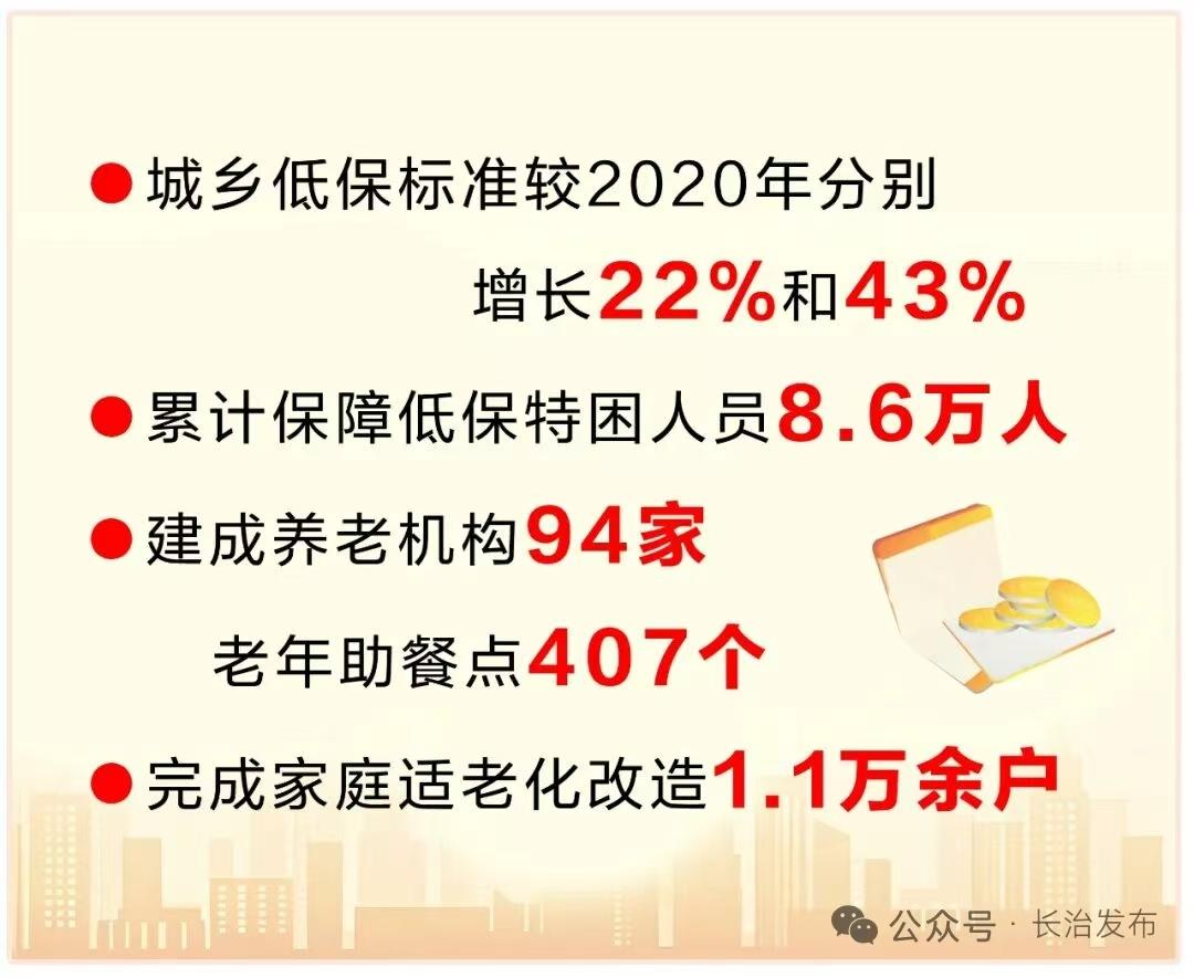 兜牢底线,擦亮“暖心民政”品牌。我市圆满完成潞城区、武乡县两项民政部社会救助改革试点,在全省率先应用低收入人口动态监测平台,实现救助“一网通办、精准认定”。“十四五”期间,城乡低保标准较2020年分别增长22%和43%,累计保障低保特困人员8.6万人,实施临时救助10.4万人次。积极应对人口老龄化,出台《长治市养老服务条例》,成立全省首个老龄健康智库。全市建成养老机构94家、老年助餐点407个,完成家庭适老化改造1.1万余户,80岁以上高龄津贴实现普惠。创新基层治理,婚姻登记实现“全国通办”,惠民殡葬政策普惠居民,智慧“二维码门牌”全面推广。
