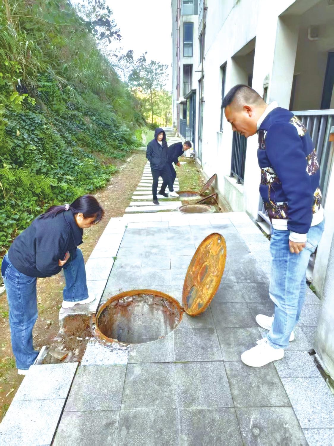 市住房城乡建设局工作人员对一小区申请动用维修资金维修下水道现场查勘。(图片由市住房城乡建设局提供)