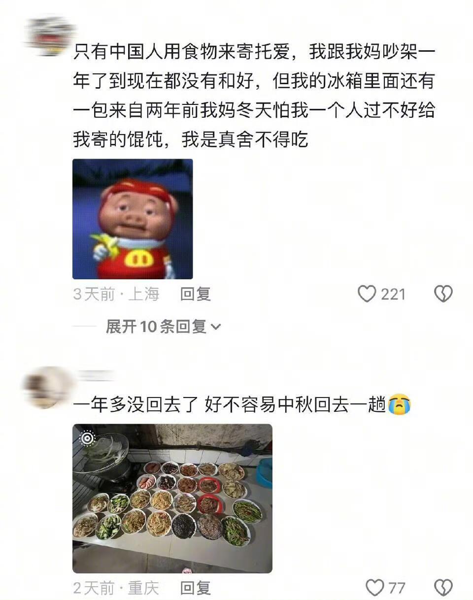 我跟我妈吵架一年了到现在都没有和好,但我的冰箱里面还有一包来自两年前我妈冬天怕我一个人过不好给我寄的馄饨,我是真舍不得吃