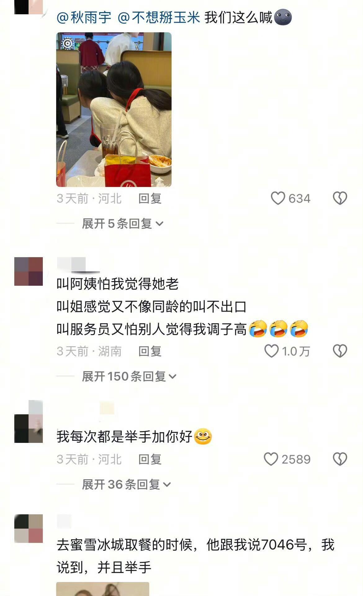 叫阿姨怕我觉得她老 叫姐感觉又不像同龄的叫不出口 叫服务员又怕别人觉得我调子高