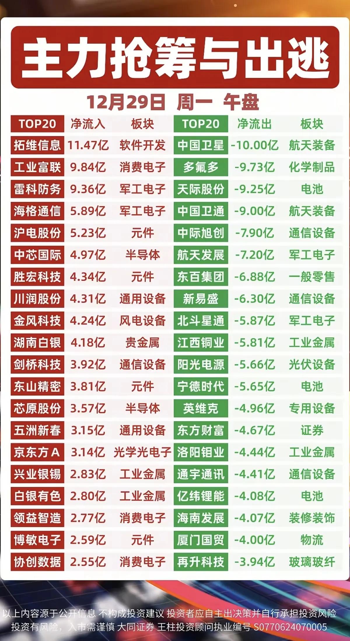 12月29日,周一A股午盘主力抢筹出逃一览表!!! 拓维信息主力资金大幅流入11.47亿,后市值得高看一眼;工业富联主力资金抢筹9.84亿,后市值得期待;雷科防务主力资金流入9.36亿,后市值得重点关注;中国卫星主力资金大幅流出10亿,后市注意风险!!!