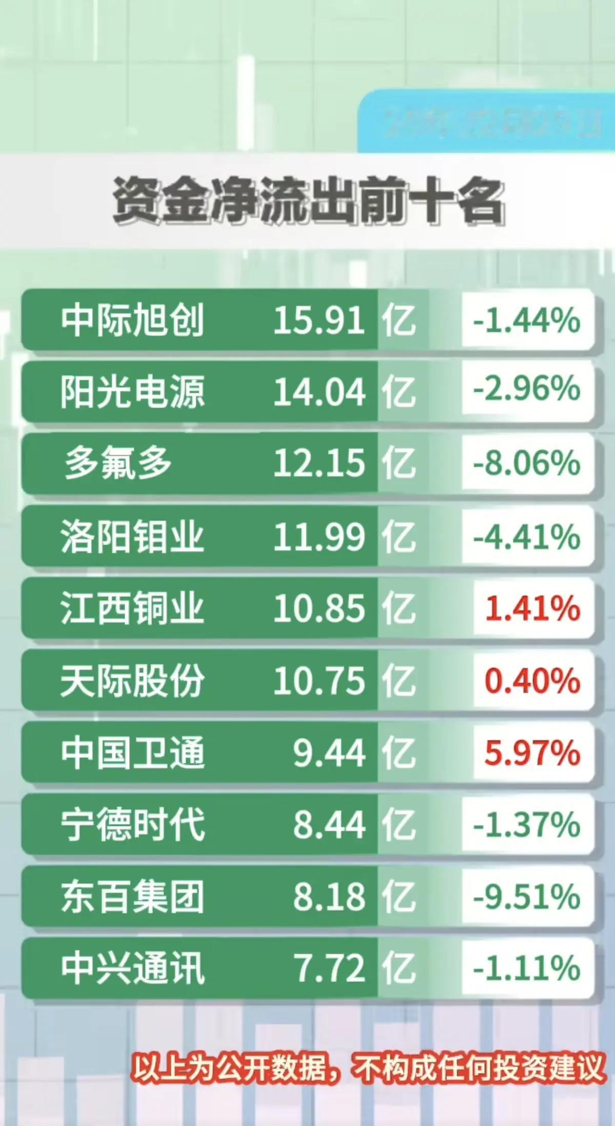 12月29日,周一A股资金流入流出一览表!!! 今日,A股拓维信息主力资金流入16.45亿,后市值得期待;雷科防务主力资金流入10亿,后市值得重点关注;中际旭创主力资金流出15.91亿,后市需小心谨慎;阳光电源主力资金流出14.04亿,后市需注意风险!!!