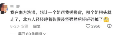 我在南方洗澡,想让一个姐帮我搓搓背,那个姐扭头就走了,北方人轻轻哼着歌,假装坚强,然后轻轻碎掉了
