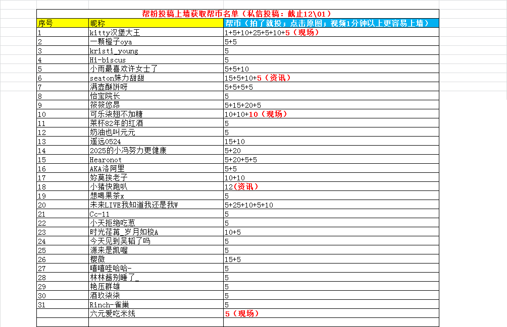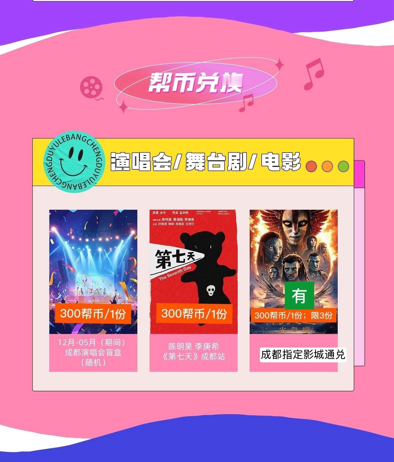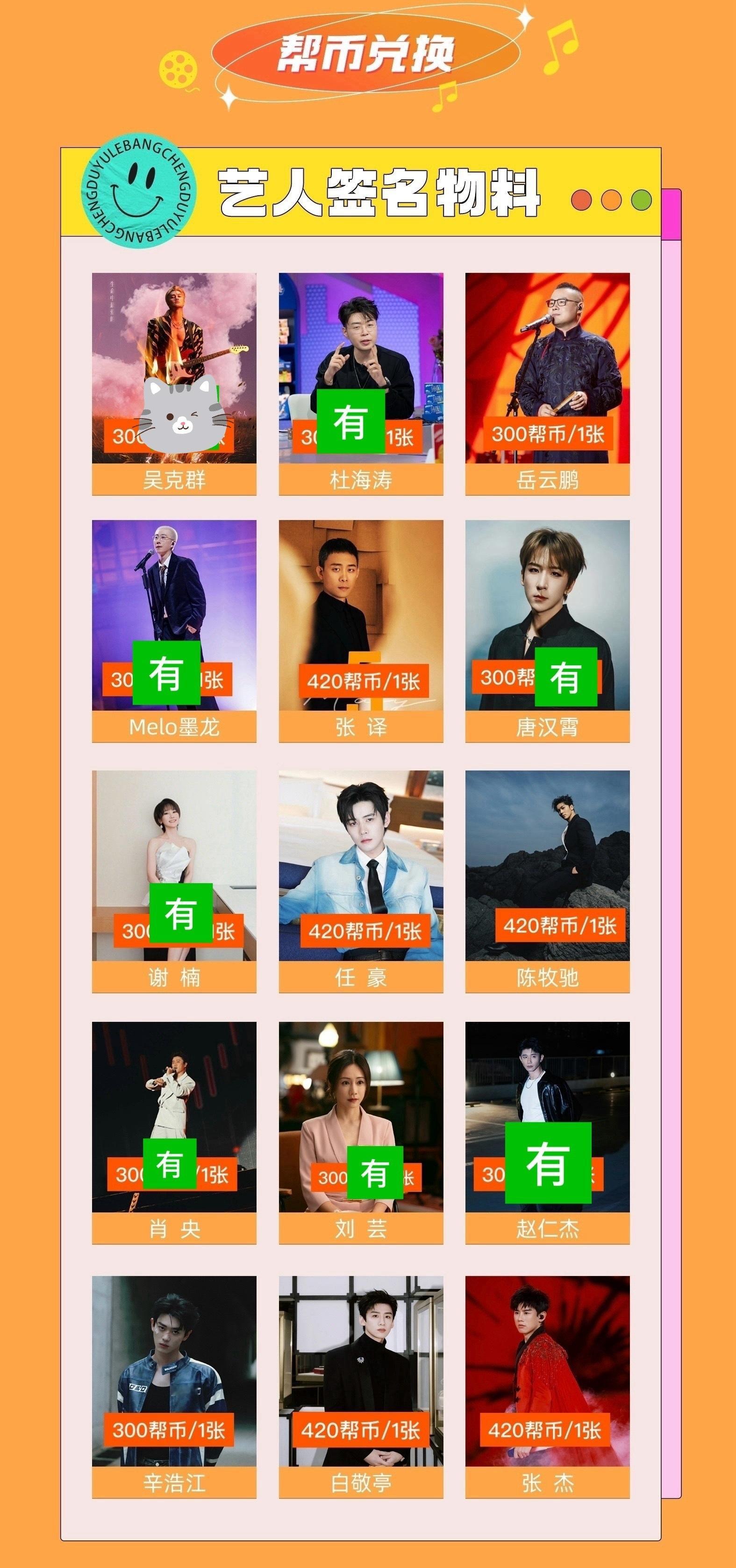 成都娱乐帮.帮币兑换库—成都娱乐帮粉丝嘉年华 𝐍𝐨.𝟗𝟐年度兑换(顺延)⚠️:有“有”的标识,全场通兑188,有帮币的可再次兑换。⚠️:帮币本次不用,自动清零。2026年以月为单位,重新计算发布。⚠️:仅限关注成都娱乐帮微博30天以上帮粉参与,已有帮币但中途取关未达到30天以上视为无效。🌟:2026粉丝嘉年华签名物料预告拟有唐九洲、罗一舟、周也、李一桐、郁可唯、Gai周廷、马丽、沈腾、马伯骞、梁靖康、胡歌、刘德华等。帮币兑换拟在300以上哈。大家可留言期待的~或许魏大勋、王源、任嘉伦、罗云熙等会释出部分。⏰兑换时间:𝟏𝟐/𝟐𝟗(周一,今日) 𝟏𝟗:𝟑𝟎-𝟐𝟐:𝟎𝟎分内在本条内容下按要求留言【我要XXX(下方图片标题),如我要兑换“赵仁杰”签名物料一张】,最先留言(以帮帮这边新浪系统显示为准)符合要求的且有帮币的兑换成功,成功后将扣除对应帮币。以实际回复则为兑换成功。本轮每人最多兑换1项产品,本轮为2025年的最后一次兑换。2025感谢有您。 成都