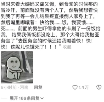 我想着快到我了再等一会儿,结果疼直接倒人家身上了,然后嘴里嘟囔着:快给我......饭,我要饿.......死.....,前面的男生吓得拿他的卡刷了一份饭给我,结果我俩饭都没吃上,那个大哥给我抱医务室了"去医务室的时候还给我喊着快!快!快!这妮儿快饿死了