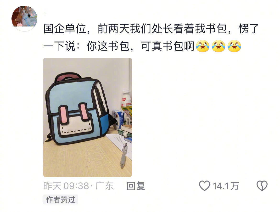 国企单位,前两天我们处长看着我书包,愣了一下说:你这书包,可真书包啊