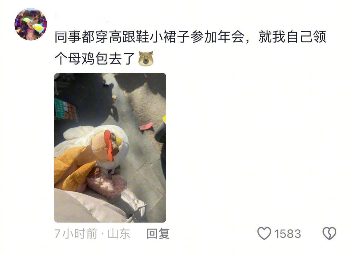 同事都穿高跟鞋小裙子参加年会,就我自己领个母鸡包去了