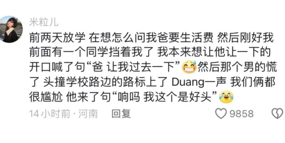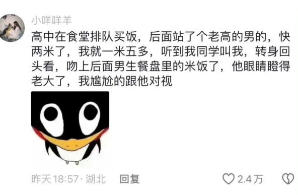 高中在食堂排队买饭,后面站了个老高的男的,快两米了,我就一米五多,听到我同学叫我,转身回头看,吻上后面男生餐盘里的米饭了,他眼睛瞪得老大了,我尴尬的跟他对视