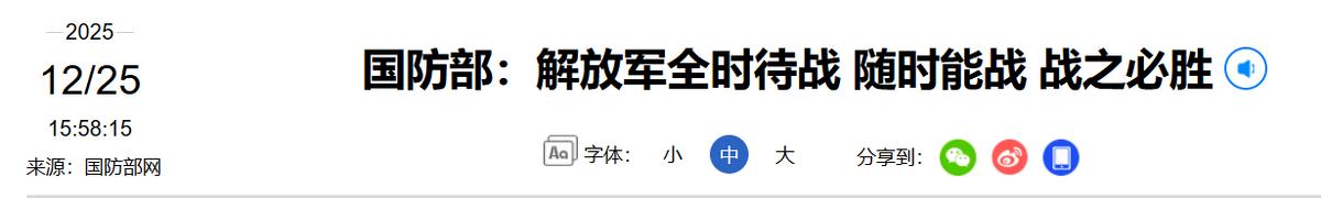摊牌了,直接下通牒!2025年12月25日,祖国统一不是2027,也不是2030!国防部:解放军全时待战,随时能战,战之必胜! 台湾是属于中国的领土,针对台湾问题,我国多次重申中国的立场。但在这个前提下,仍有部分国家试图干涉我国的内政。近期日本,美国等一些国家就公然干涉了台湾问题。 首先是日本首相在11月初的时候,公开将台湾同日本挂钩。此事引起极大争议,我国发布多则警告,但日方仍不知悔改。 在中日关系因此而恶化的时候,好不容易有所缓和的中美关系,也因为美国的一个举动再度恶化。特朗普政府再次宣布对台军售,并且创下了美国政府史上对台军售之最。 针对美国对台军售的行为,我国直接采取了反制措施,美国紧跟着倒打一耙。多个国家介入我国内政,促使我国近期多次对台问题表态。 而就在最近这段时间,随着台湾问题越发突出。网络上出现了一种声音,那就是中国会在2027或者2030的时候实现统一。在和统无望的情况下,这一声音的出现是在暗示大陆会采用武力统一的方式。 随着讨论热度越来越高,2025年12月25日的时候。在国防部举行的例行记者会议中,国防部新闻发言人就回答了类似的提问。在回答记者提问的时候,发言人直接摊牌,强调解放军全时待战,随时能战,战之必胜! 大陆不是没有武力统一的能力,而之所以没有一直武力统一,主要不希望枪口对准同胞。但台独分子恰恰借这一点而猖狂,其行为简直就是自寻死路。 对此,您怎么看?欢迎评论区留言您的看法。 (信息来源:国防部:解放军全时待战 随时能战 战之必胜-国防部网)