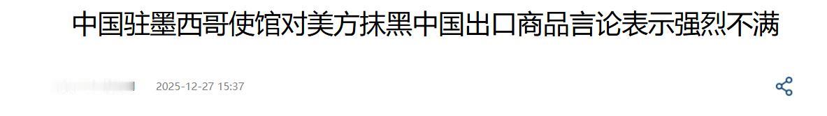准备接招吧!2025年12月27日,我国驻墨使馆怒斥,而这只是第一声发令枪! 当我国的贸易出口在全球占比越来越高,我国国际影响力得到提升的时候。美国不止一次的对我国泼脏水,不止一次的在国际公开场合渲染中国威胁等言论。 而就在近期,美国白宫贸易和制造业高级顾问纳瓦罗就在墨西哥媒体上发表文章,去恶意的攻击我国出口的商品,以此来煽动墨西哥对我国的情绪。 据他发文表示,中国的商品损害了墨西哥本土的产业等。以此来煽动墨西哥去效仿美国的行为,对我国加征高昂关税。此事引起国际高度讨论,我国更是在第一时间对此做出了回应。 2025年12月27日的时候,我国驻墨西哥大使馆直接针对此事发布了严正的声明。声明中明确指出此类言论极为卑劣,我国强烈不满以及坚决反对。 美国作为全球经济贸易体系的主要获利方,理应去承担一定的责任。但是美国不仅没有承担责任,反而还试图实施霸权。 美国一方面受益于全球贸易体系,一方以“不公平竞争”为借口,去在全球范围内搞单边关税,严重破坏了全球贸易的公平。 针对他所指的我国出口商品损害了墨西哥本土商品,不可否认的是,我国同墨西哥的相关商品确实存在一定的竞争。这并不意味着,我国商品损害了墨西哥的本土产业,毕竟有竞争才能够有发展。 对此,您怎么看?欢迎评论区留言您的看法,我们一起讨论一下。 (信息来源:中国驻墨西哥使馆对美方抹黑中国出口商品言论表示强烈不满-中国新闻网)