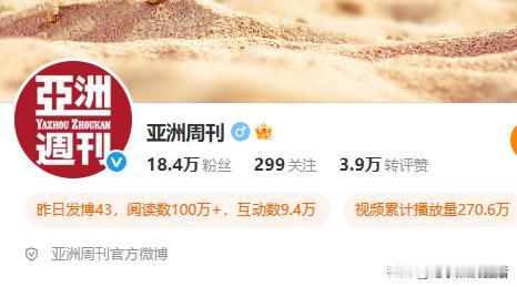 《亚洲周刊》虽然把所有关于南京博物院和徐院长的帖子都删除了,可以看出来他是十分的意难平啊,如今也只能通过内涵突然和内涵段子,来发泄自己的不满与不甘心了! 不过有意思的是,《亚洲周刊》的粉丝量这几天在大量的增加,从他刚开始接受庞叔令女士的委托,帮她发表声明的时候,粉丝量也就10w+左右,到昨天应该是16w+的量,现在再刷新就变成了18.4w+了总粉丝量了,也就是说通过庞家这件事,更多的人看到《亚洲周刊》的所作所为还是值得别人关注的,发表的内容还有有人原因看的。 不过胳膊再厉害,最终还是扭不过大腿,最后的结局还是要弃车保帅!