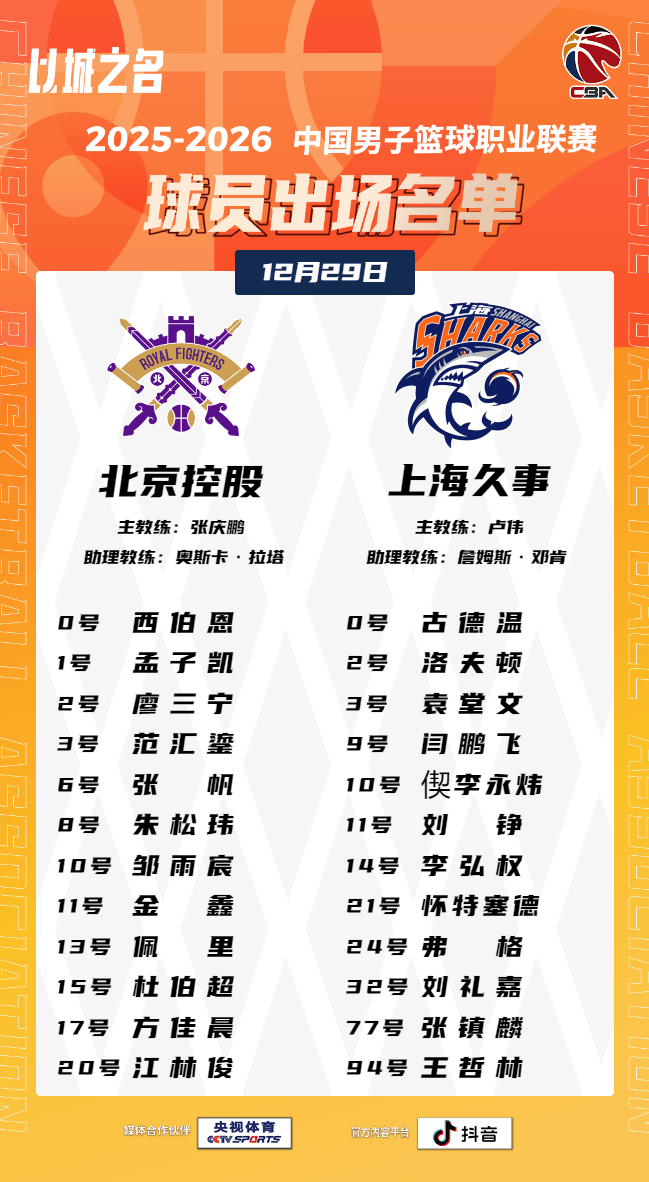 虎扑12月29日讯今日CBA常规赛,北控对阵上海的大名单已经出炉。
