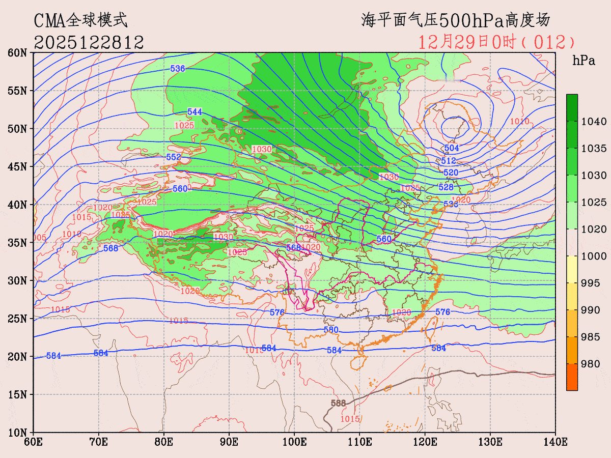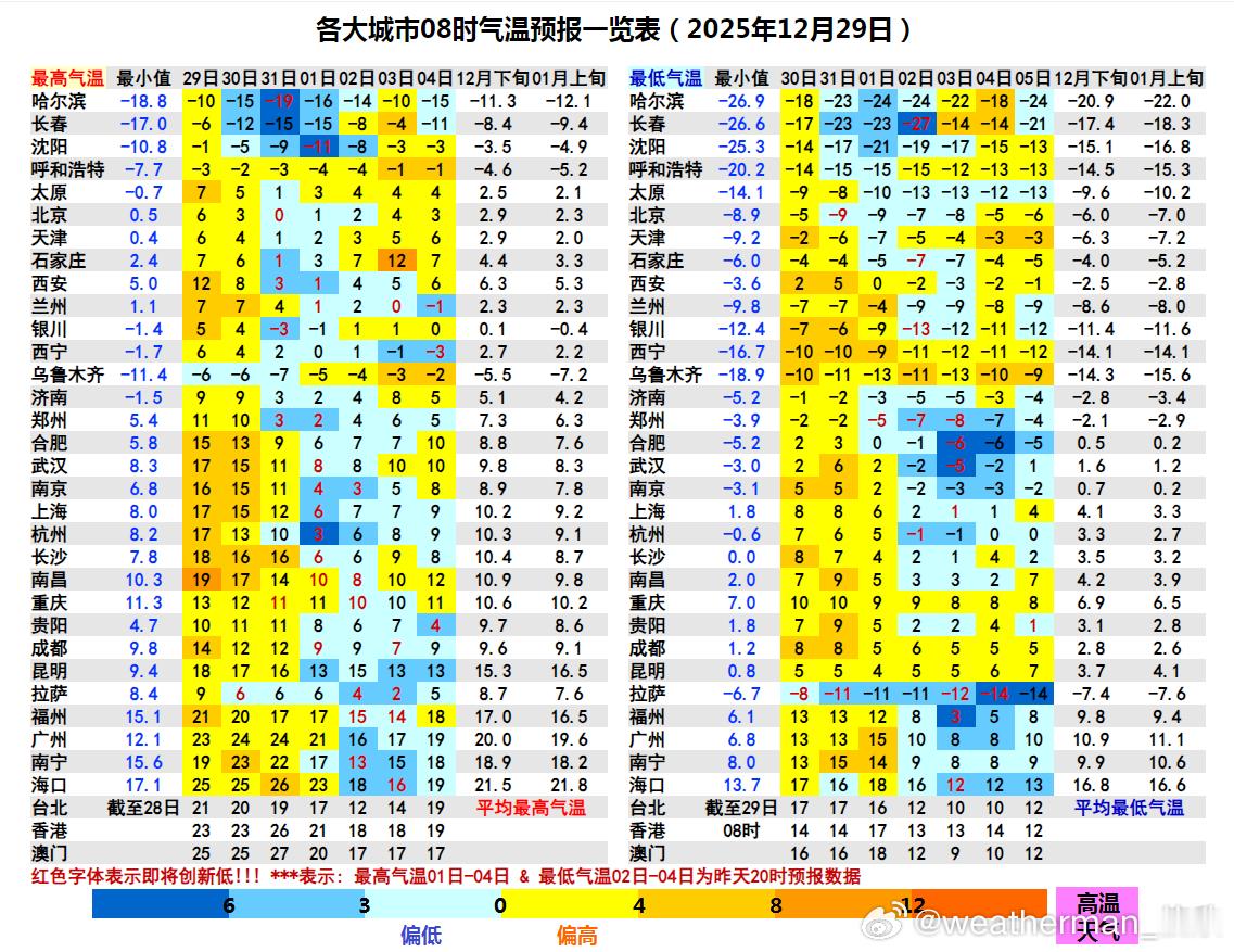 【一周天气——冷空气活跃】本周(12月29日-1月4日),冷空气不断南下,气温大多呈现震荡下滑,之后有所反弹,从偏高转偏低再回正常水平附近。30日南支槽发展,槽前暖湿气流北上与冷空气交汇,31日前后,我国将有大范围的雨雪。另外随着冷空气不断南下,霾在向南转移过程中减弱消散。具体关注:1、降水本周降水先增多再缩减。31日-1日晨将是降水范围最大的时段。预计2025年12月30日-2026年1月1日,西藏东部、西北地区东部、华北南部、内蒙古东部、东北地区、黄淮西部、江汉西部、江淮等地部分地区有小到中雪或雨夹雪,局地大雪或暴雪;西南地区东部、江南、华南等地有小到中雨,局地大雨。图1为官方报,图2为我国数值预报,图3为欧洲数值预报的降水分布。图4-5为形势场预报。本周冷空气源源不断南下,30日南支槽发展加强,槽前西南暖湿气流北上,因此30日-1日在冷暖空气交汇下,黄河以南将有大范围雨雪。由于暖湿气流主要从西南方来,与低空冷空气东北风交汇,降水东边缘,呈现西北-东南走向。这就使得偏东北的区域,未必有降水。太原-南京一线,处于降水边缘,一旦暖湿气流不及预期,这一线就可能调出降水区。这次过程降雪最强区域,可能在秦岭、大巴山、伏牛山区,也就是陕西南部、河南西部和湖北西北部。西安在30日夜间-31日可能先雨后雪,初雪悬念不大,但量级待定,越早转雪,雪越大。1月1日白天以后,随着低空偏北风南下,暖湿气流败退,降水开始缩减。1月2日以后,我国多地又会变为晴朗干燥。但西南地区,1月2-4日,还会受到西南暖湿气流影响,阴雨雪频繁。2、气温本周冷空气从贝加尔湖和蒙古一带,源源不断南下。29-30日,内蒙古、华北北部、东北地区等地气温下降4~6℃,其中内蒙古中东部、东北地区部分地区降温8~10℃,局地10℃以上。12月30日-明年1月2日,黄河以南大部气温将下降6~8℃,局地降温10℃以上,多地气温在元旦前后可能降至低谷,甚至创立冬后新低。部分城市最高气温:31日哈尔滨零下19℃、银川零下3℃、石家庄1℃、1日沈阳零下11℃、西安1℃、郑州2℃、武汉8℃、南京4℃、杭州3℃、上海6℃、长沙6℃;2日南昌8℃、重庆10℃、福州15℃、南宁13℃,都可能创立冬后新低。不过2-4日我国多地气温有所回升,气温从偏低回到正常水平附近或转偏高。3、霾29日至30日,受冷空气影响,华北、黄淮等地霾天气逐步减弱消散,受传输影响,江淮、江汉等地有短时霾天气。此后,未来一周,全国大部地区大气扩散条件较好,无持续性霾天气。