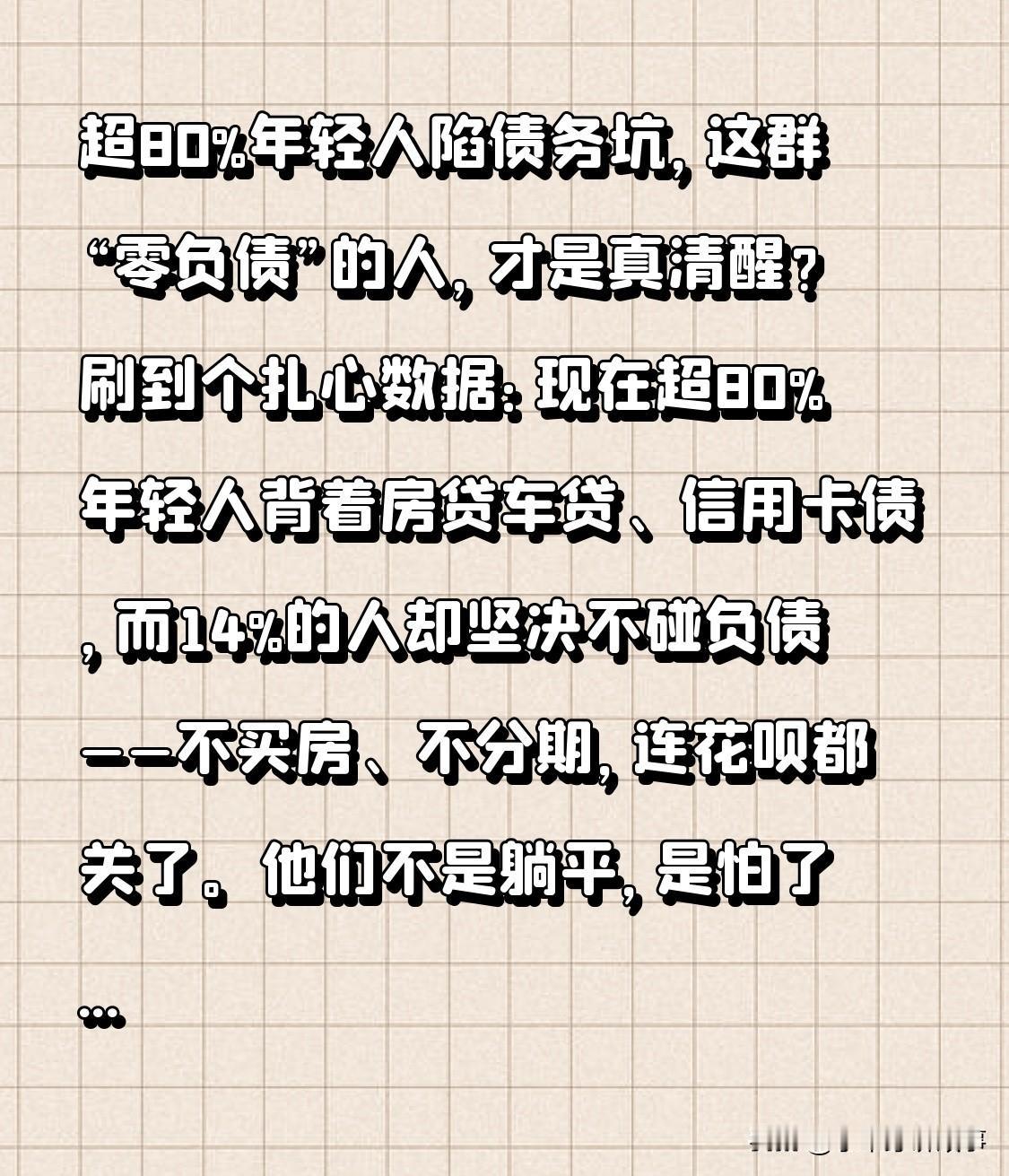 超八成年轻人陷入债务陷阱,这群“零负债”者,才是真清醒? 刷到个扎心数据:当下超八成年轻人背负房贷车贷、信用卡债,14%的人却坚决不碰负债,不买房、不分期,连花呗都关了。 他们并非躺平,是心有余悸:同事失业断供,房子被法拍;朋友为还房贷,三年没吃火锅。 零负债的畅快,试过才知:不用记还款日,不用拆东补西,月薪三千也能安睡,这“掌控感”比“有房有车”的面子强百倍。 你说,这是躺平,还是对生活最清醒的抉择? (评论区聊聊:你敢做“零负债”的人吗?)