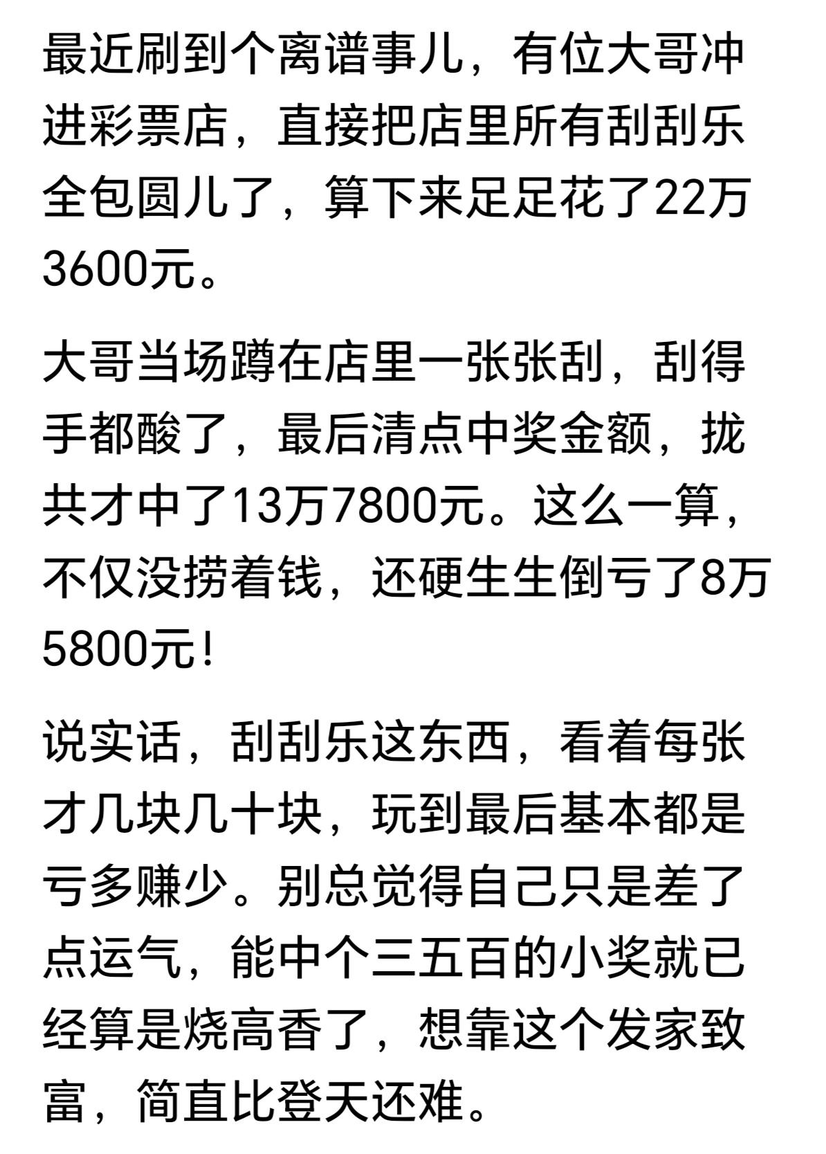 总的来说,他还是赚了,彩票总额的50%用于开奖,而他,中了13.7800,高于出11万元的23760元,137800/223600,中奖率是61.63%,高于预计中奖率11.63%。从另一角度看,超过预计中奖率50%的23.26%,而从羸利来说,他亏了总投入的39.4%。由此可见,靠买彩票中大奖发财,是不可能的,你永远是输家。所以,买彩票,靠的是运气。他这种包圆的方式,只能说是赌博。