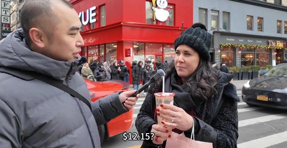 蜜雪冰城在纽约开店,一位up拿着1.99刀一杯的柠檬水在街头让路人品尝后猜测价格