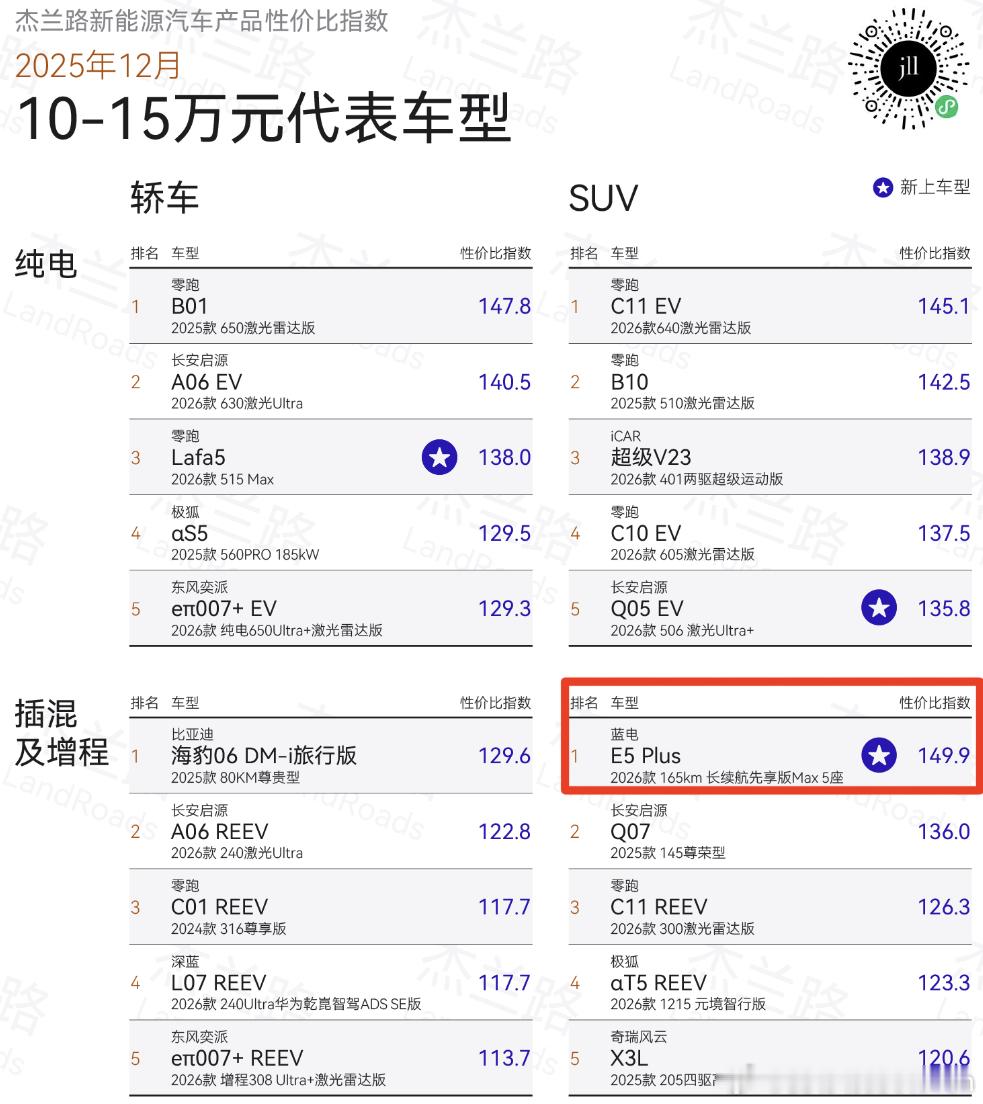万万没想到,在厮杀最凶狠的5-10万,以及10-15万这两个价位,蓝电E5Plus竟然都是性价比指数最高的。说明用户对产品和价格都相当满意啊,搞的不错啊,明年新车有搞头蓝电e5plus赛力斯