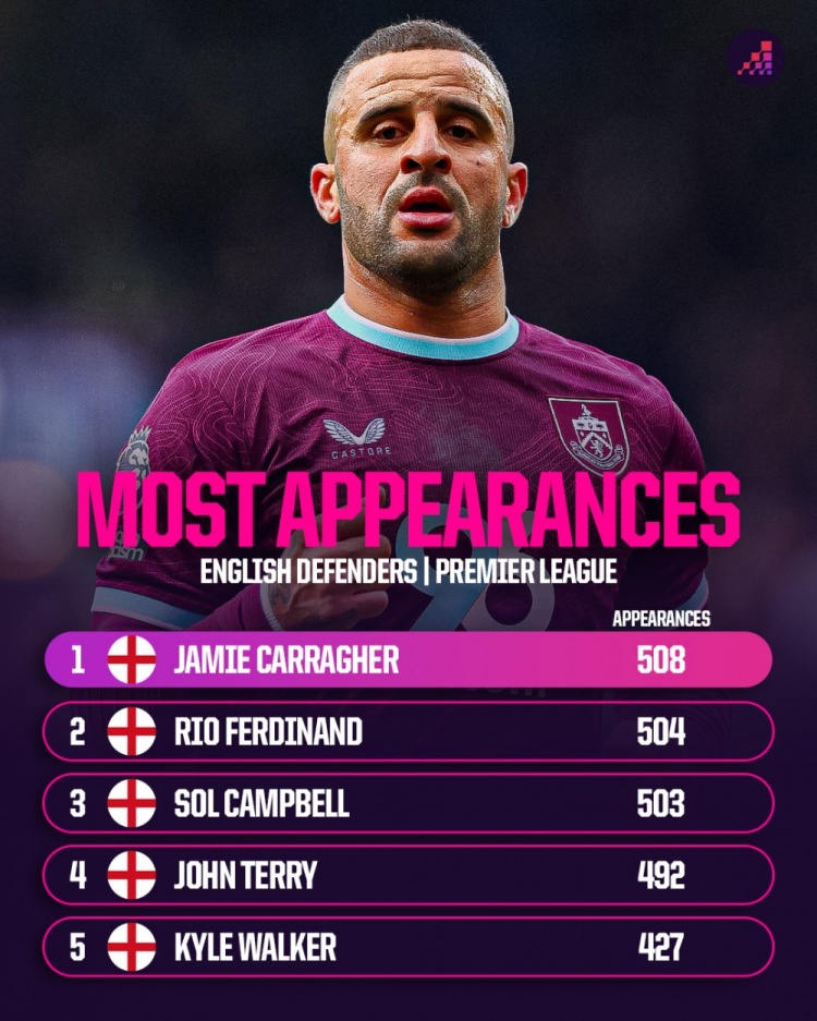 直播吧12月29日讯Opta统计了英格兰后卫在英超的出场次数,并列出榜单,卡拉格508场居首,沃克427场第五。