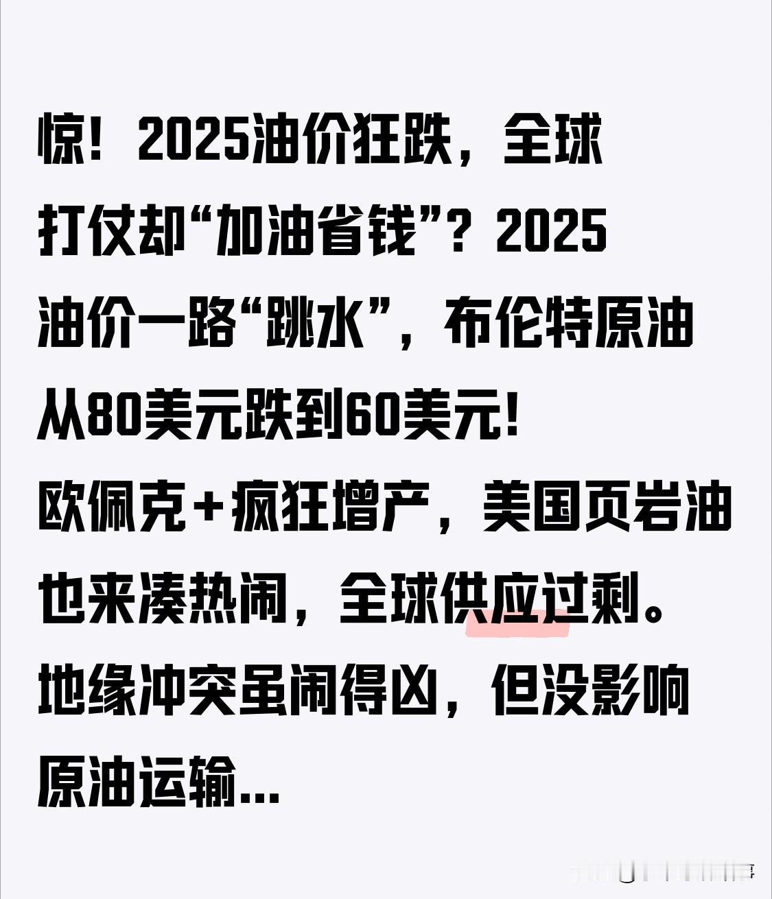 惊!2025年油价暴跌,全球局势紧张竟能“加油省钱”? 2025年油价一路“跳水”,布伦特原油从80美元降至60美元。欧佩克+大幅增产,美国页岩油也参与其中,致全球供应过剩。地缘冲突未影响原油运输,溢价不再。且全球经济放缓、新能源车增多,需求疲软。机构预测2026油价更低,短期加油还能省,市场变化真魔幻! 油价 油价分析 油价走向 国际油价 全球石油价格
