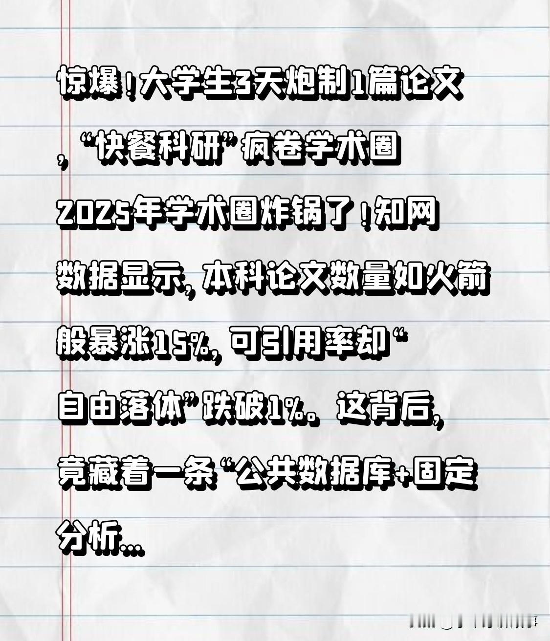 惊爆!大学生3天拼凑出一篇论文,“快餐科研”席卷学术圈 2025年,学术圈炸开了锅。知网数据表明,本科论文数量激增15%,引用率却跌破1%。背后藏着“公共数据库+固定分析模板”的论文流水线,学生输入数据,3小时自动生成图表,3天就能凑出万字论文。 专家怒斥,这种“学术快餐”批量制造学术垃圾,粉碎科研初心。可不少学生无奈表示,普通二本不这样,拿什么和名校拼资源?论文成“速成品”,学术尊严何在?