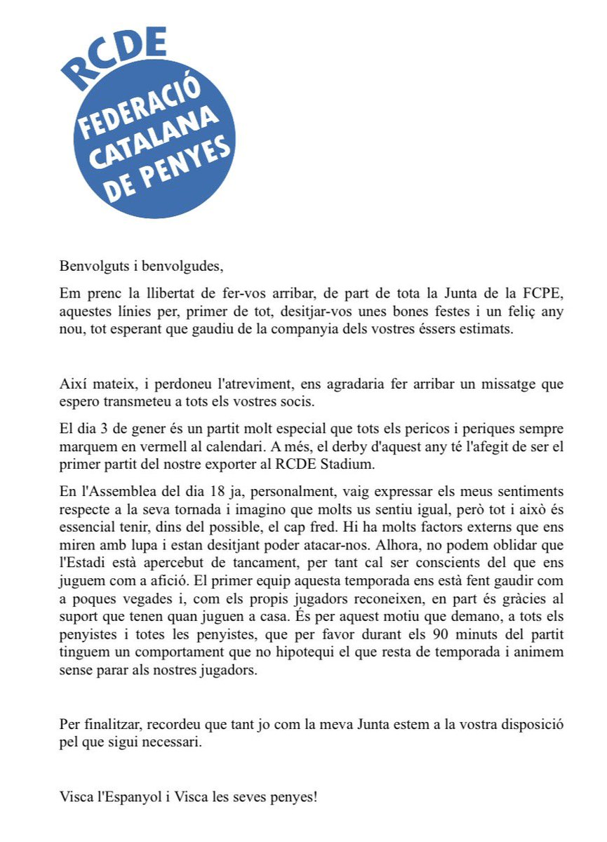 对此,西班牙人球迷会加泰罗尼亚联合会(FCPE)官方发布声明,呼吁球迷加泰德比理性为主队加油助威