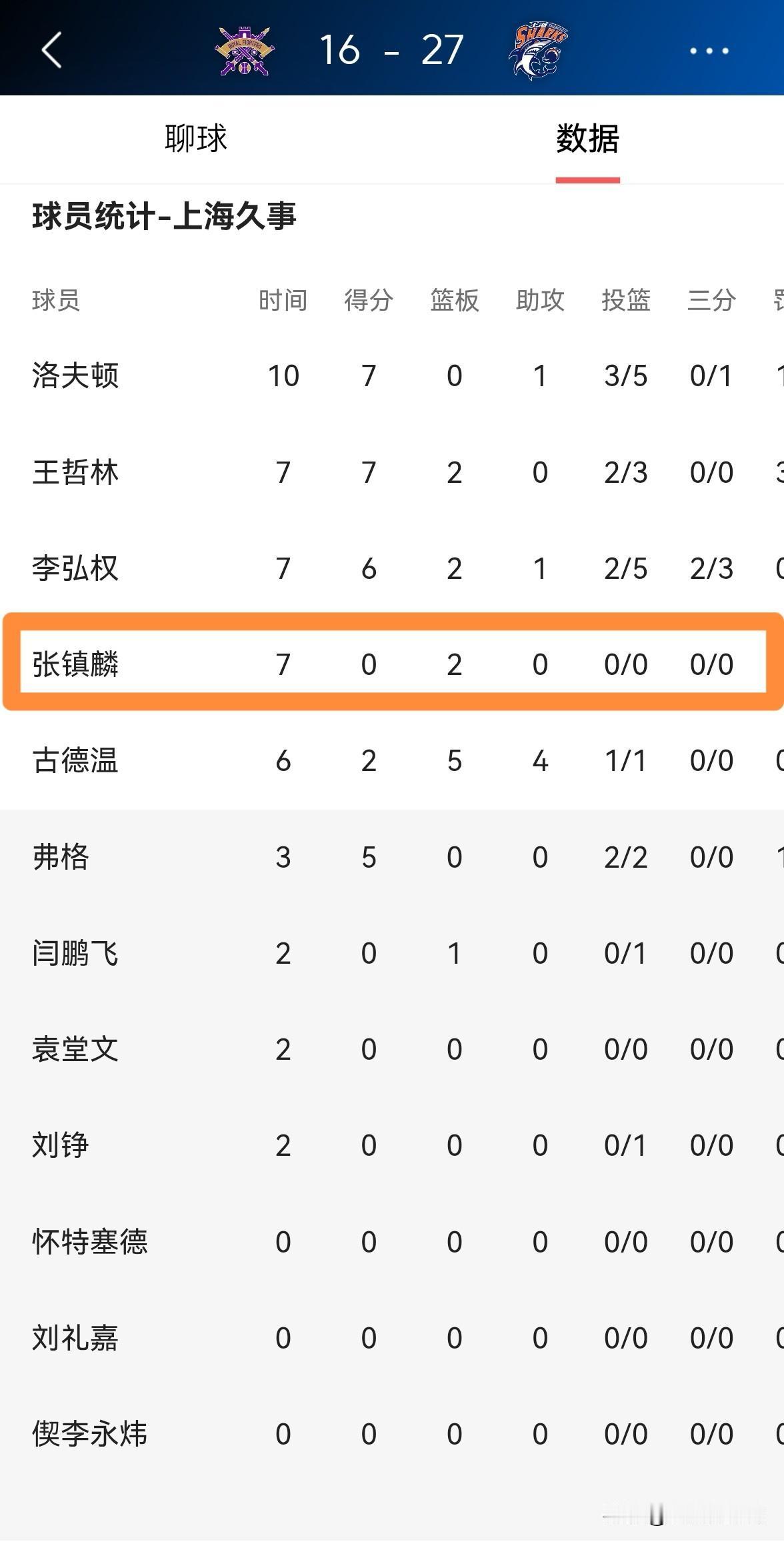 上海久事超级球星张镇麟真是太憋屈了!在今天上海久事客场挑战北京控股的比赛中,目前双方的第一节比赛已经结束,上海久事以27:16领先对手。让人感到非常震惊的是,在第一节比赛中,张镇麟首发出战7分钟,竟然没有捞到任何的出手机会,仅仅抢到了2个篮板。 众所周知,在张镇麟效力辽宁本钢的时候,他拥有无限开火权,可是到了上海久事,张镇麟竟然连出手机会都没有了,你说他心里能不憋屈吗?
