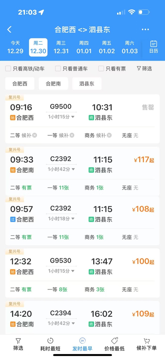 12306APP显示,从12月30日起,合肥每天共有5趟高铁列车发往泗县,折后票价100元起。其中,2趟高铁列车始发站是合肥西站;2趟高铁列车始发站是合肥南站,经过合肥西站;1趟高铁列车始发站是安庆站。合肥至泗县东的二等座票价6.1折起,最低仅需100元。
