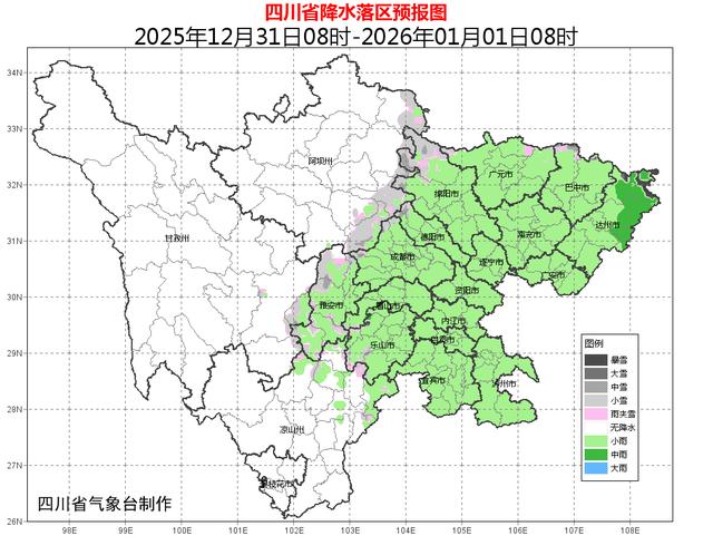 31日白天到晚上:盆地各市阴天有小雨,北部有3-5级偏北风,高海拔山区有雨夹雪或小雪;川西高原和攀西地区大部晴间多云,其中阿坝州东部阴天间多云有阵雪(雨)。