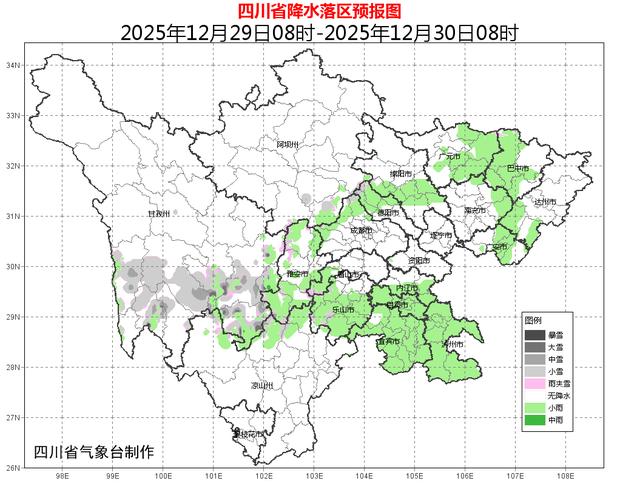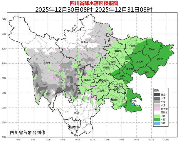 30日白天到晚上:盆地各市阴天有小雨,其中达州、巴中、南充、广安、遂宁、资阳、泸州7市和广元、内江2市东部有中雨,高海拔山区有雨夹雪或小雪;甘孜州中部南部、阿坝州东部南部和凉山州北部阴天间多云有阵雪(雨),局部中到大雪,川西高原和攀西地区其余地方多云转晴。