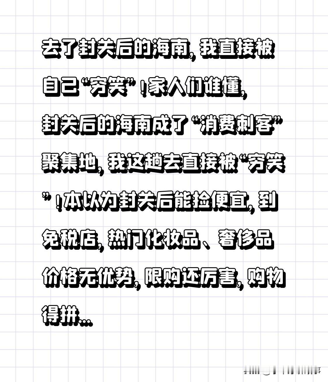 震撼!到封关后的海南一游,我竟被自己的“穷”逗笑! 家人们谁懂,封关后的海南成了“消费刺客”扎堆处,这趟旅行直接把我“穷笑”! 本以为封关后能捡漏,到免税店才发现,热门化妆品、奢侈品价格没优势,限购还严格,购物得拼手速、抢额度。 景区门票贵,项目还单独收费,玩几个项目钱包就空了。吃饭也闹心,海鲜价高,普通炒菜能抵内地一顿大餐。 本想潇洒游购,却被物价狠狠教育,这趟海南之行,“穷”得明明白白!