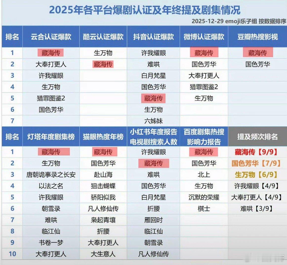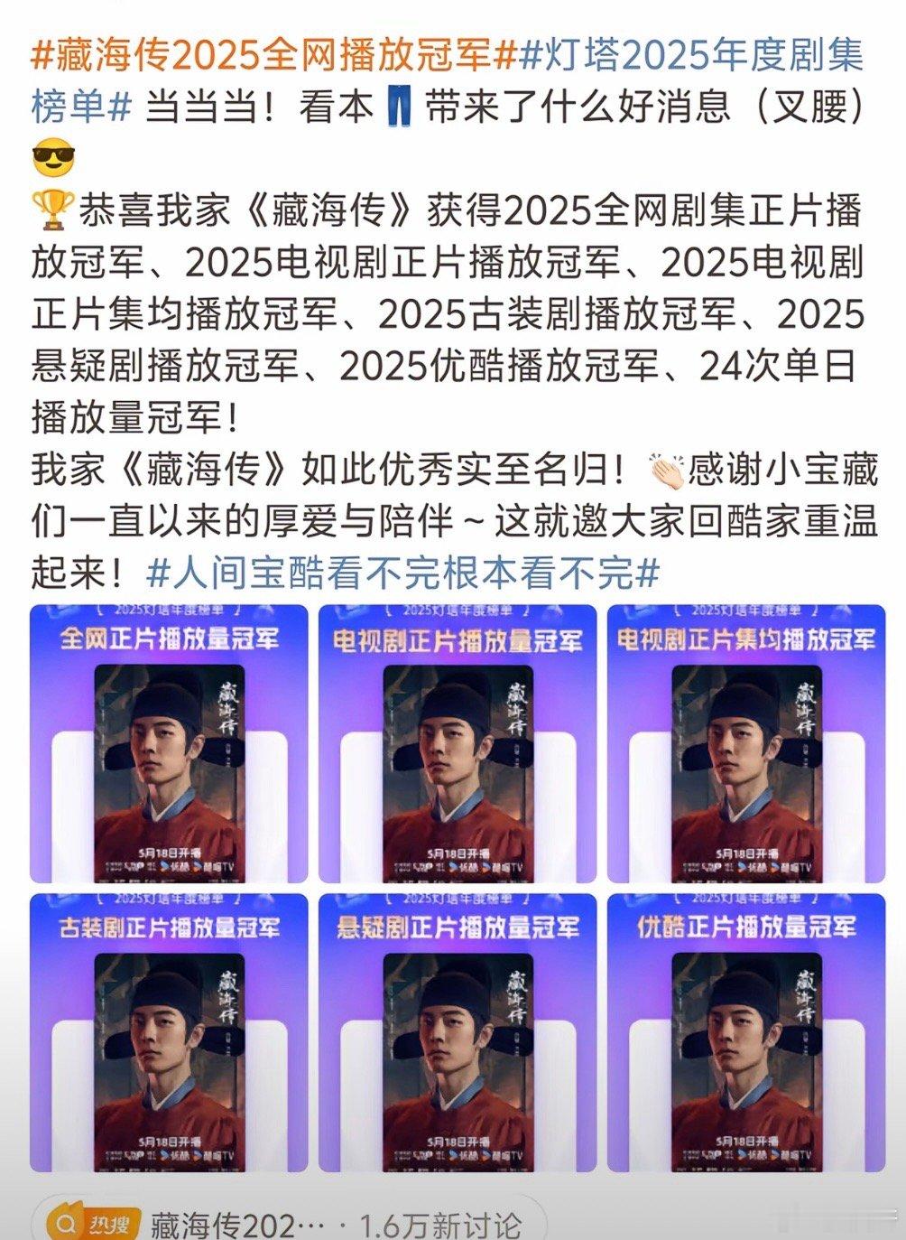 要知道藏海传是史上唯一九榜官方全认证爆剧,三大平台年冠,爆得最无可争议的唯一剧王