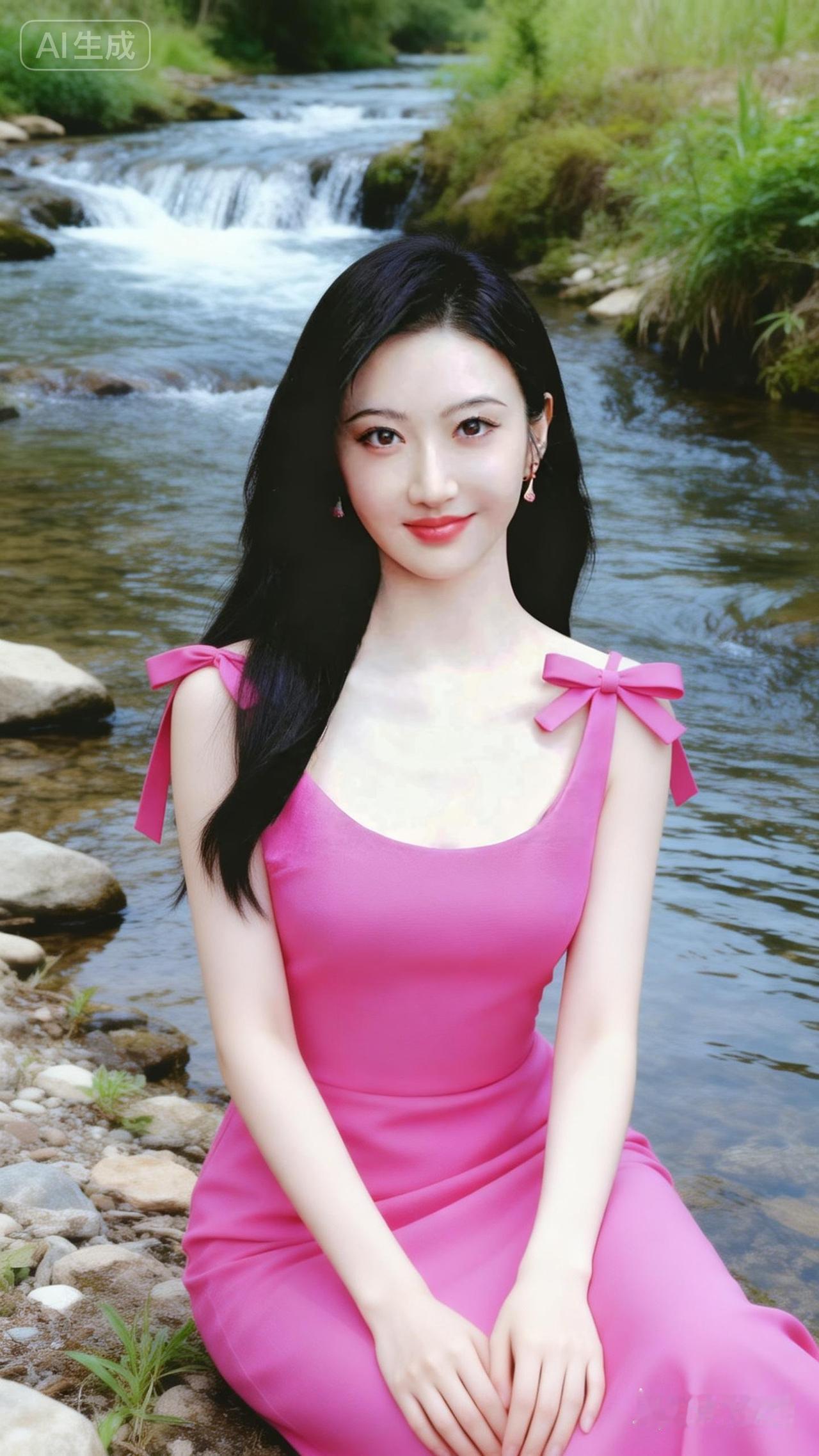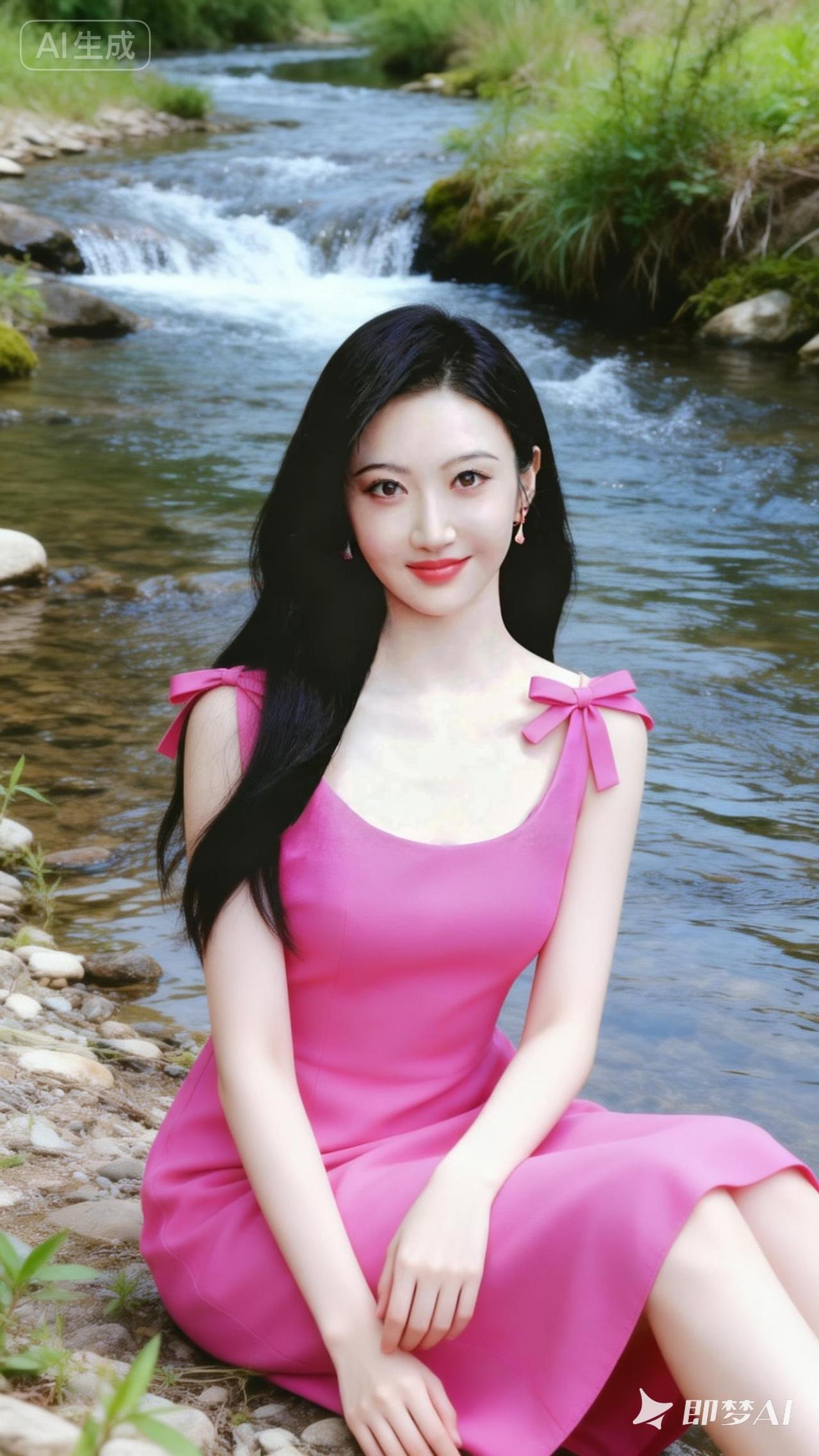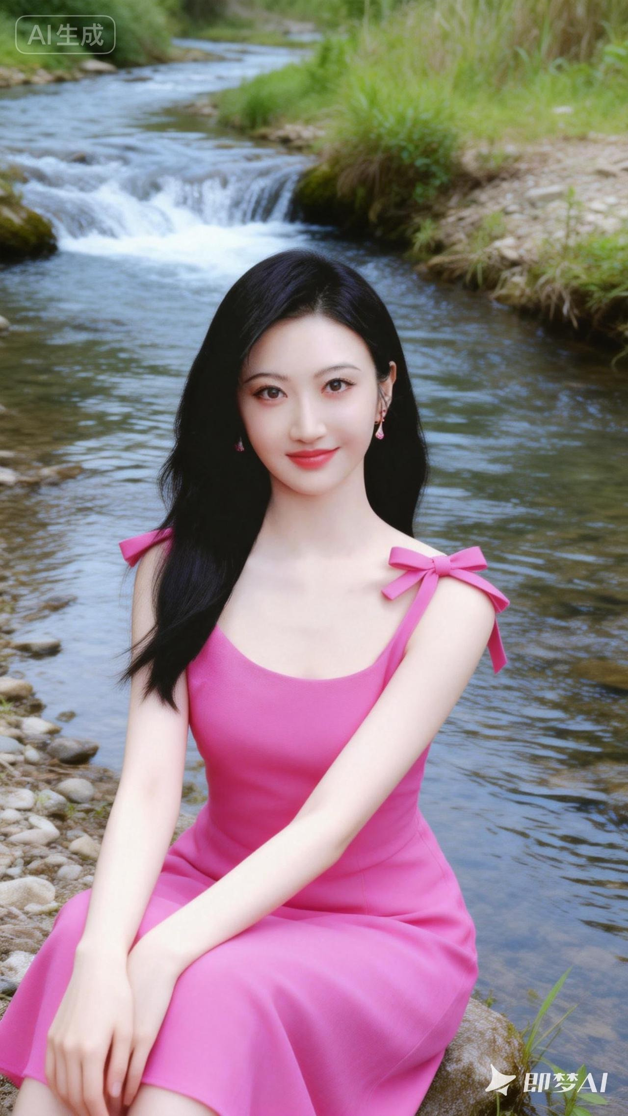 在溪流边,穿粉色裙子的少女,甜美如画。